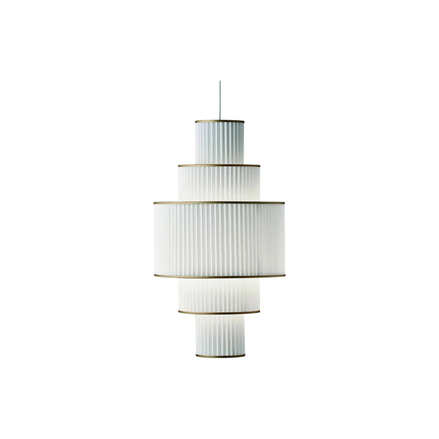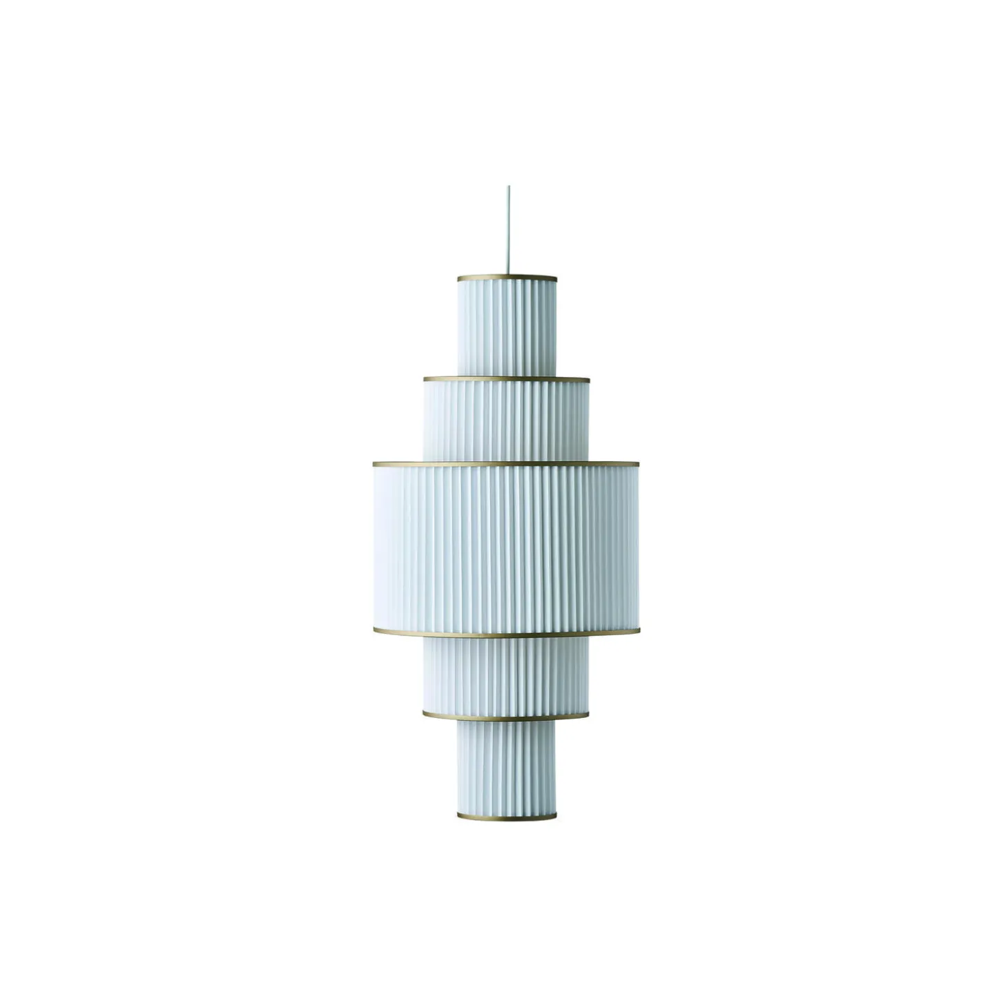 PLIVELLO pendel golden i aluminium, stål og papir fra LE KLINT. Farve: hvid. Mål: H: 97 x Ø 48 cm. Lyskilde: E27. Design: Christian Troels.