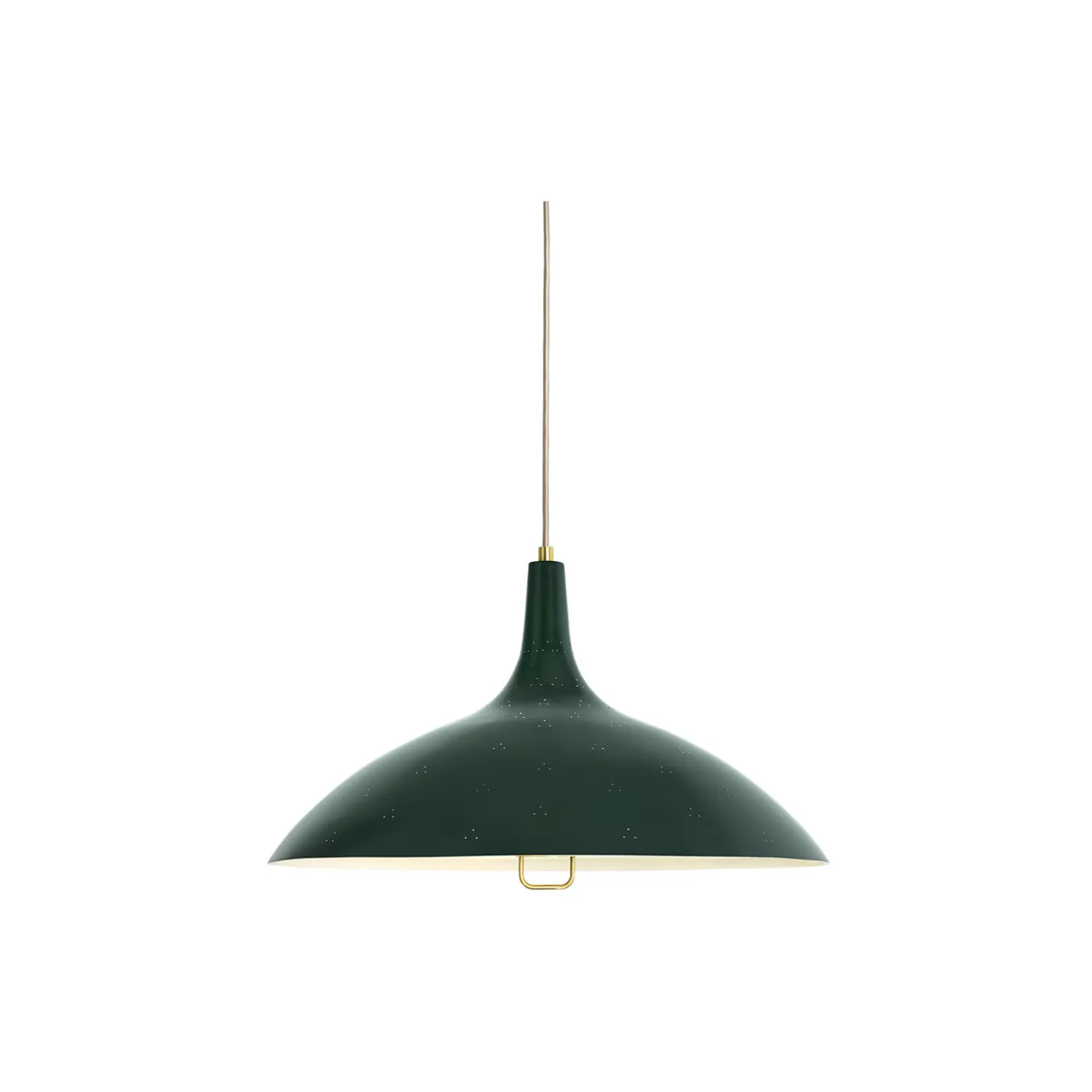 1965 Pendant i lakeret stål, baldakin i poleret messing og diffuser i glas fra GUBI. Farve: bistro green. Mål: H: 26 x Ø 46 cm. Lyskilde: 6-10W LED E27. Design: Paavo Tynell.