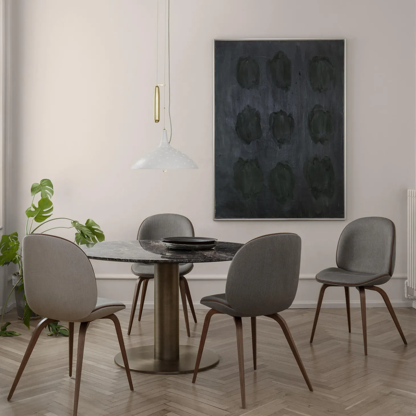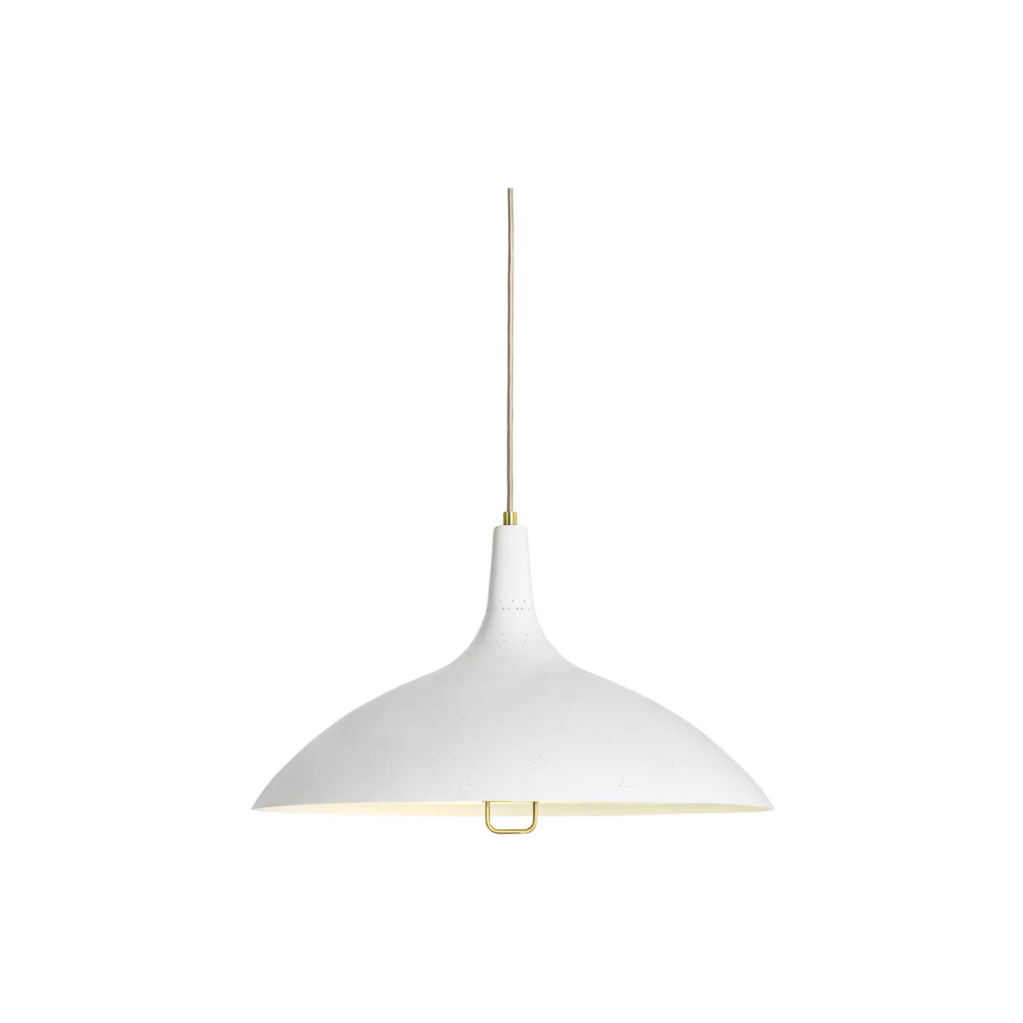 1965 Pendant i lakeret stål, baldakin i poleret messing og diffuser i glas fra GUBI. Farve: classic white. Mål: H: 26 x Ø 46 cm. Lyskilde: 6-10W LED E27. Design: Paavo Tynell.