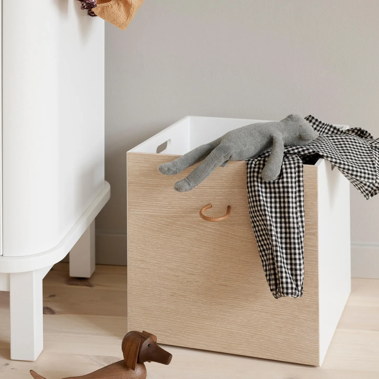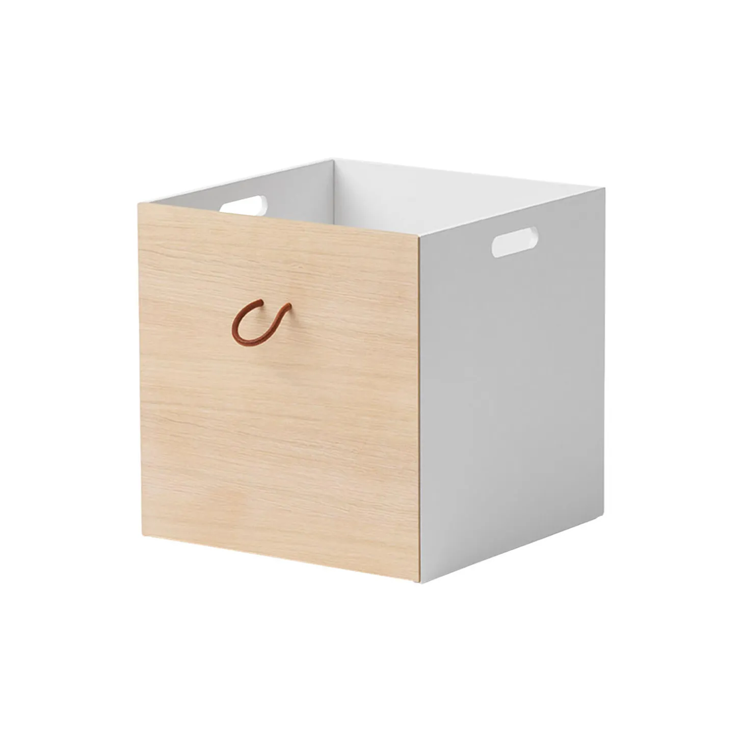 Wood opbevaringskasser passer til alle Wood reoler. Opbevaringskasserne har 3 hvide sider og en side i eg. Derudover har de 2 små greb af kernelæder til løft og udtræk. De 2 greb er monteret på kassens side i hvid samt på siden i eg. På den måde vælger man individuelt, om kassens front ud til rummet skal være hvid eller eg, en feature som har stor betydning for reolens udtryk.Wood opbevaringskasser er fremstillet i MDF, der er konstrueret træ, der består af 60% birk, 20% fyrretræ og 20% asp træ. MDF er meget stærkt og holdbart. Den ene side af opbevaringsboksen er lavet af fineret egetræ.Stilen er skandinavisk med rene linjer og fine detaljer som små greb af kernelæder.Opbevaringskasserne er produceret i Europa og overholder de strenge EU-krav for sikkerhed og sundhed. Kasserne er behandlet med ikke-giftig, vandbaseret maling og olie til hvid-olieringen.