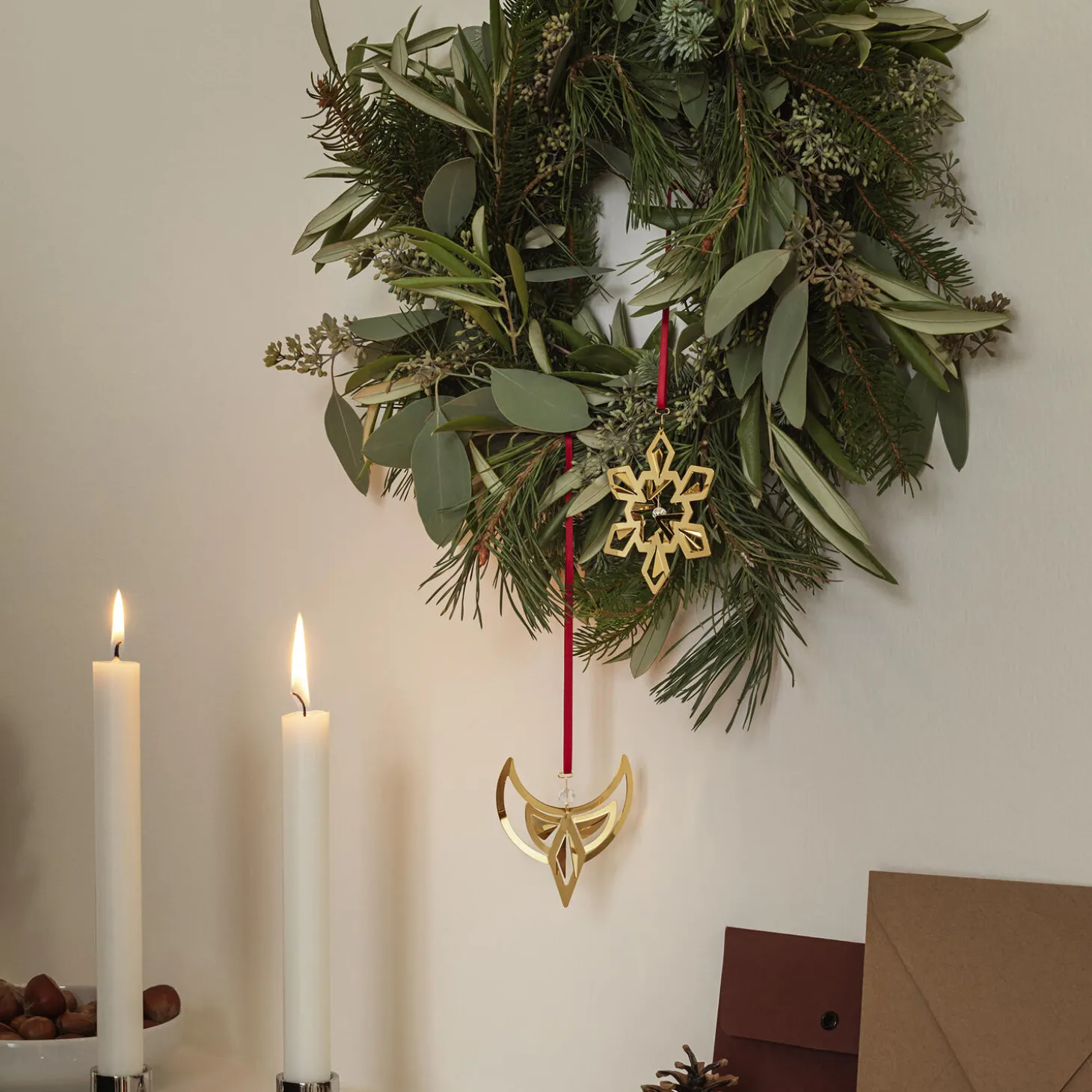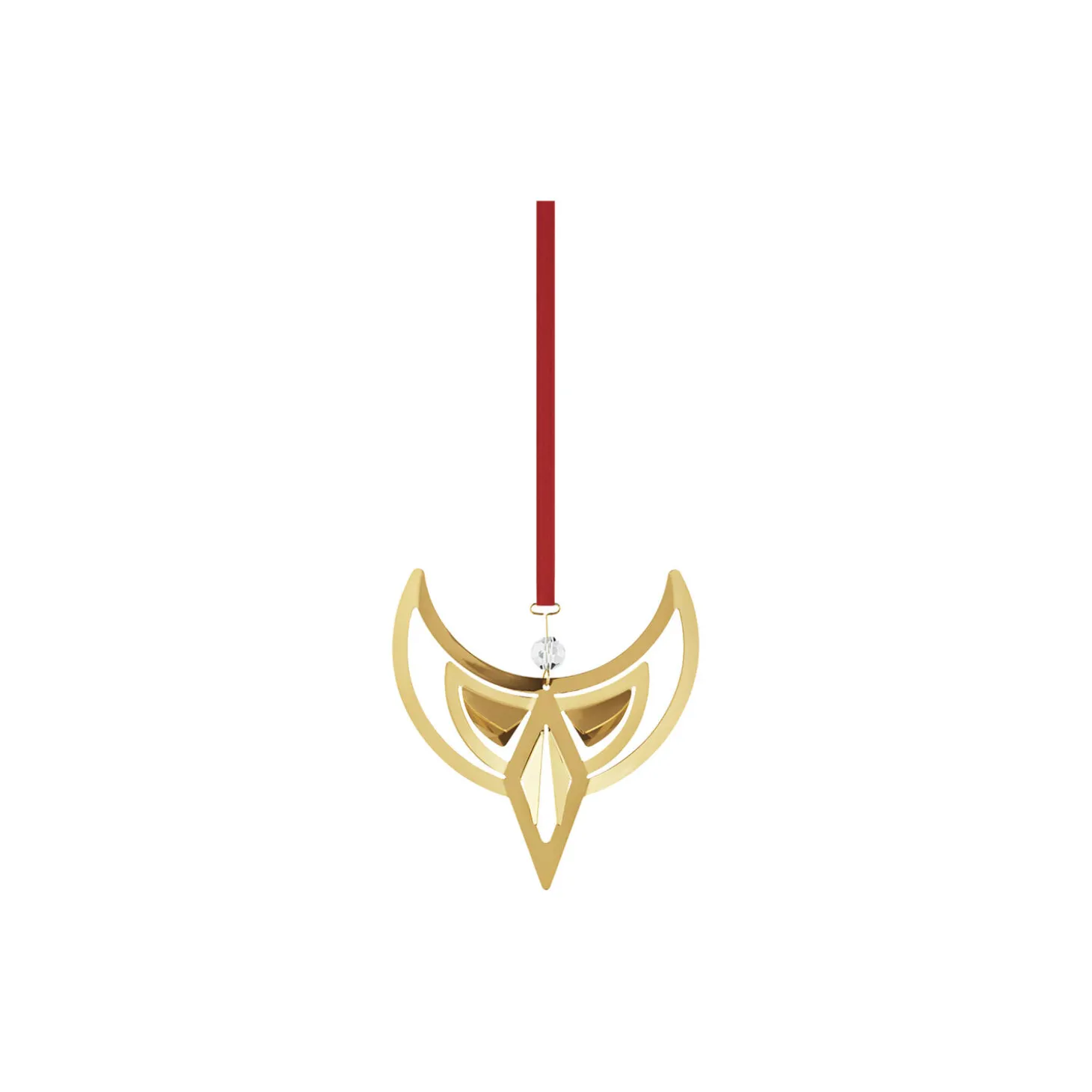 Dette smukke engleornament fra 2024 Julekollektionen er belagt med 18 karat guld og designet af Georg Jensens mangeårige samarbejdspartner Sanne Lund Traberg. Ornamentets elegante form er flankeret af gyldne vinger og har en glimtende zirkon-kugle i toppen. Engleornamentet hænger i et flot, rødt bånd. Der medfølger også et blåt bånd, som symboliserer julekollektionens tema: en stjerneklar vinternat.