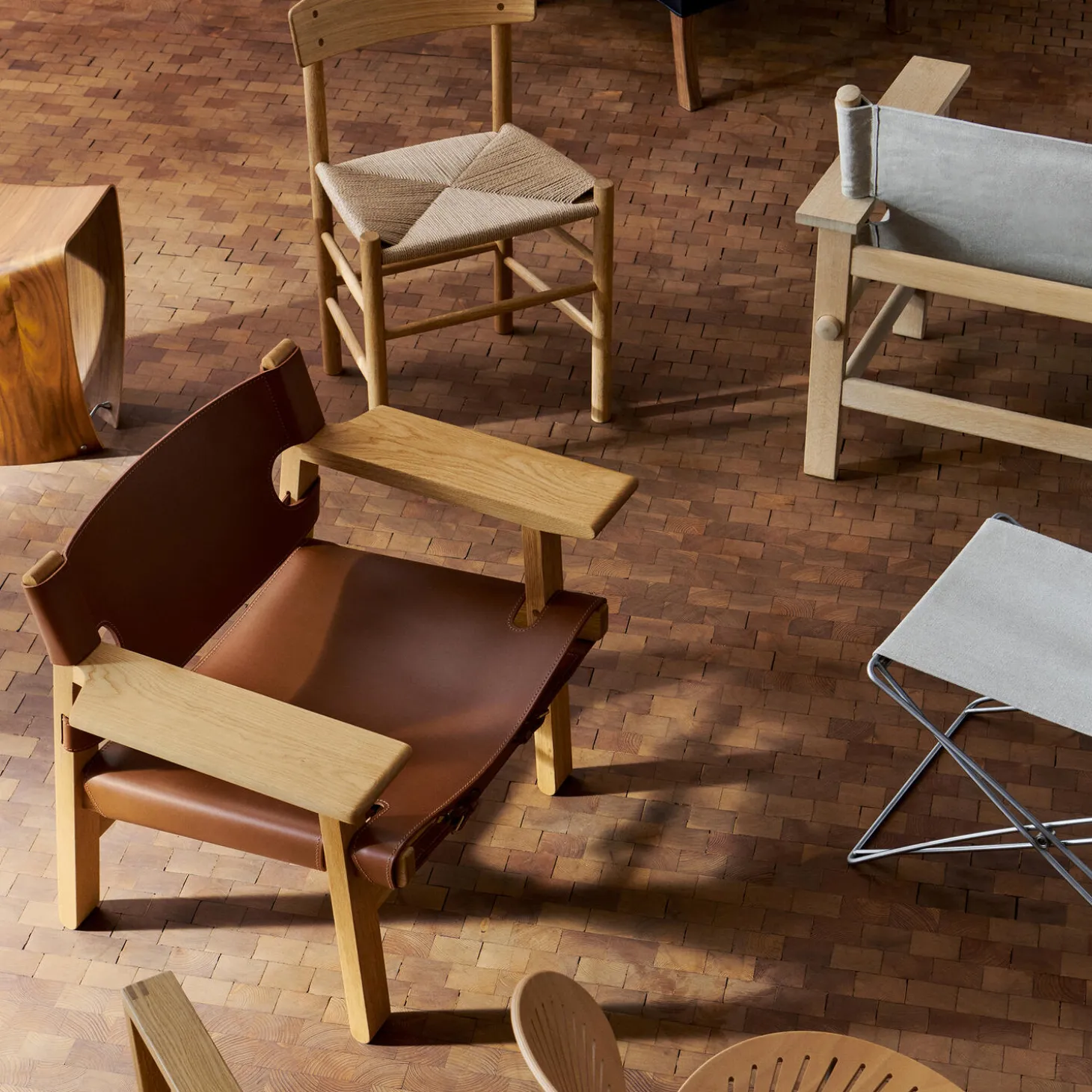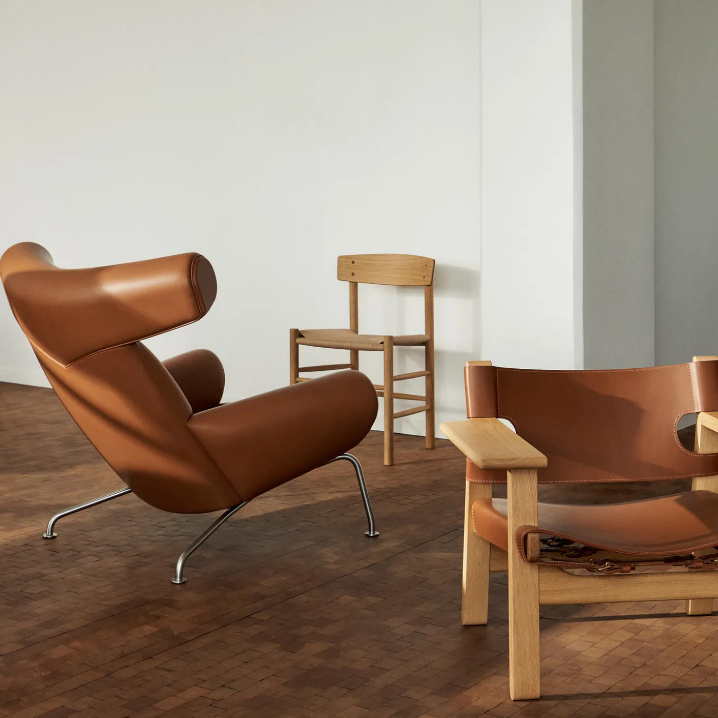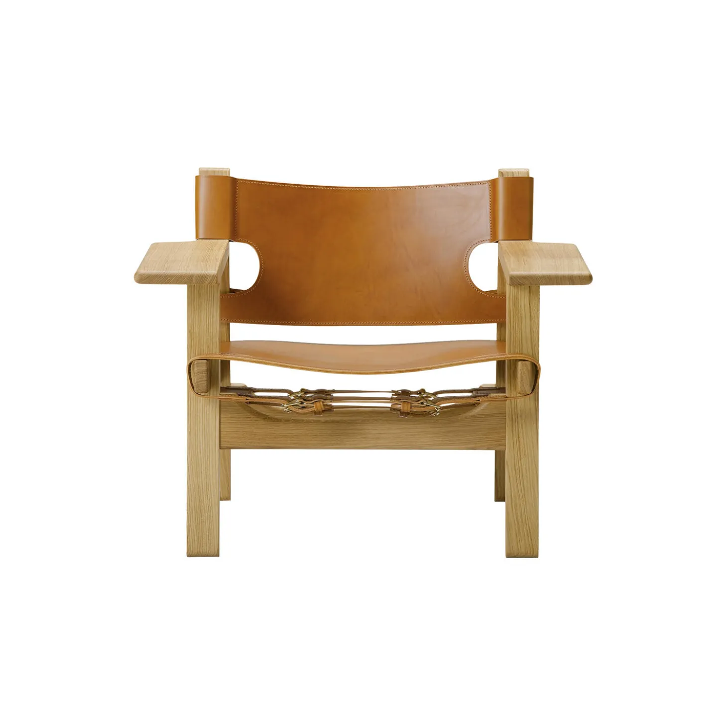 2226 Den Spanske Stol i olieret eg og kernelæder fra Fredericia. Farve: cognac/olieret eg. Mål: H: 67 x B: 82,5 x D: 60 cm. Siddehøjde: 33 cm. Design: Børge Mogensen.