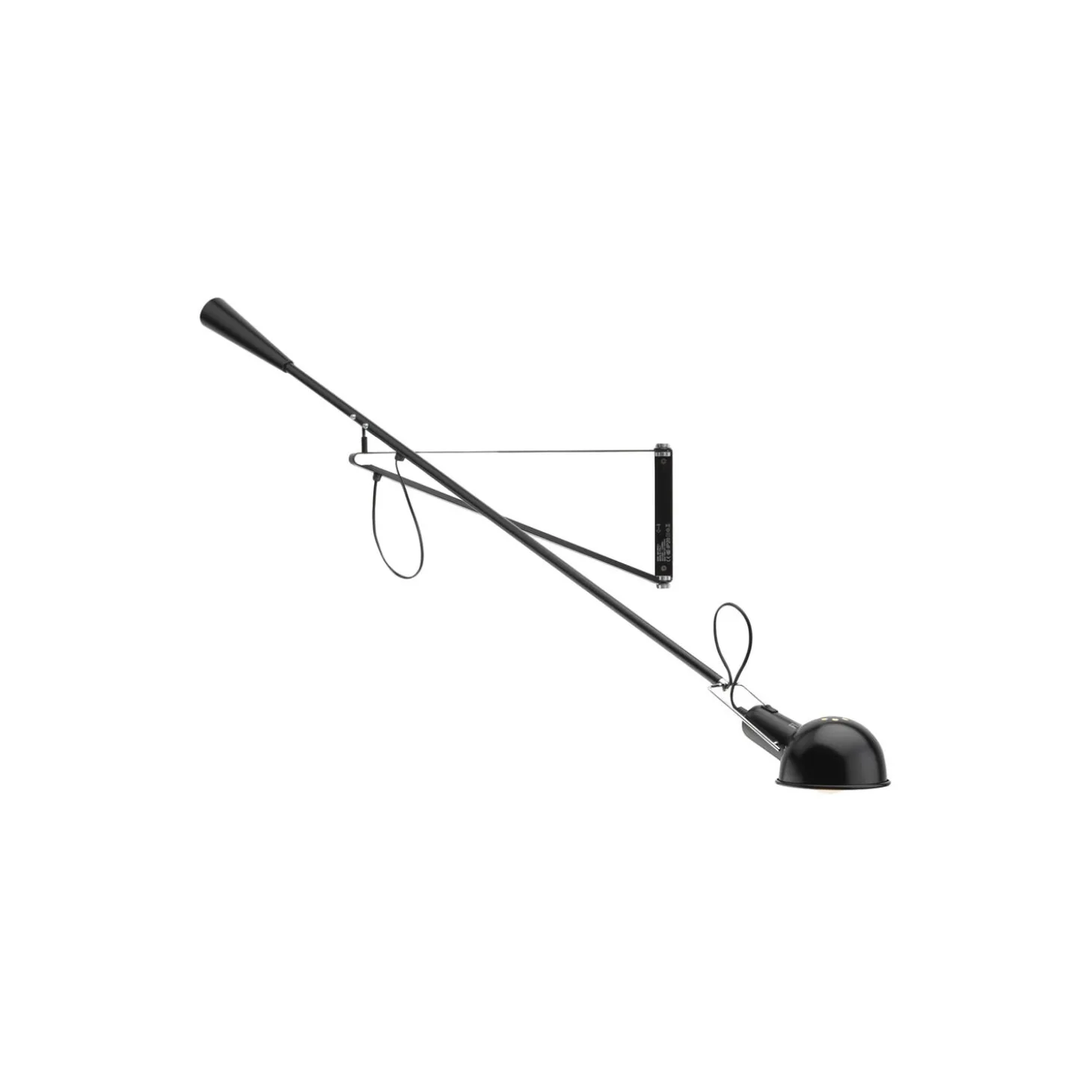 Væglampen giver direkte lys. Justerbar arm og reflektor af lakeret stål. Refleksstøtte i forkromet messing. Støbejerns tilspidset kontravægt. Vægbeslag af malet stål.