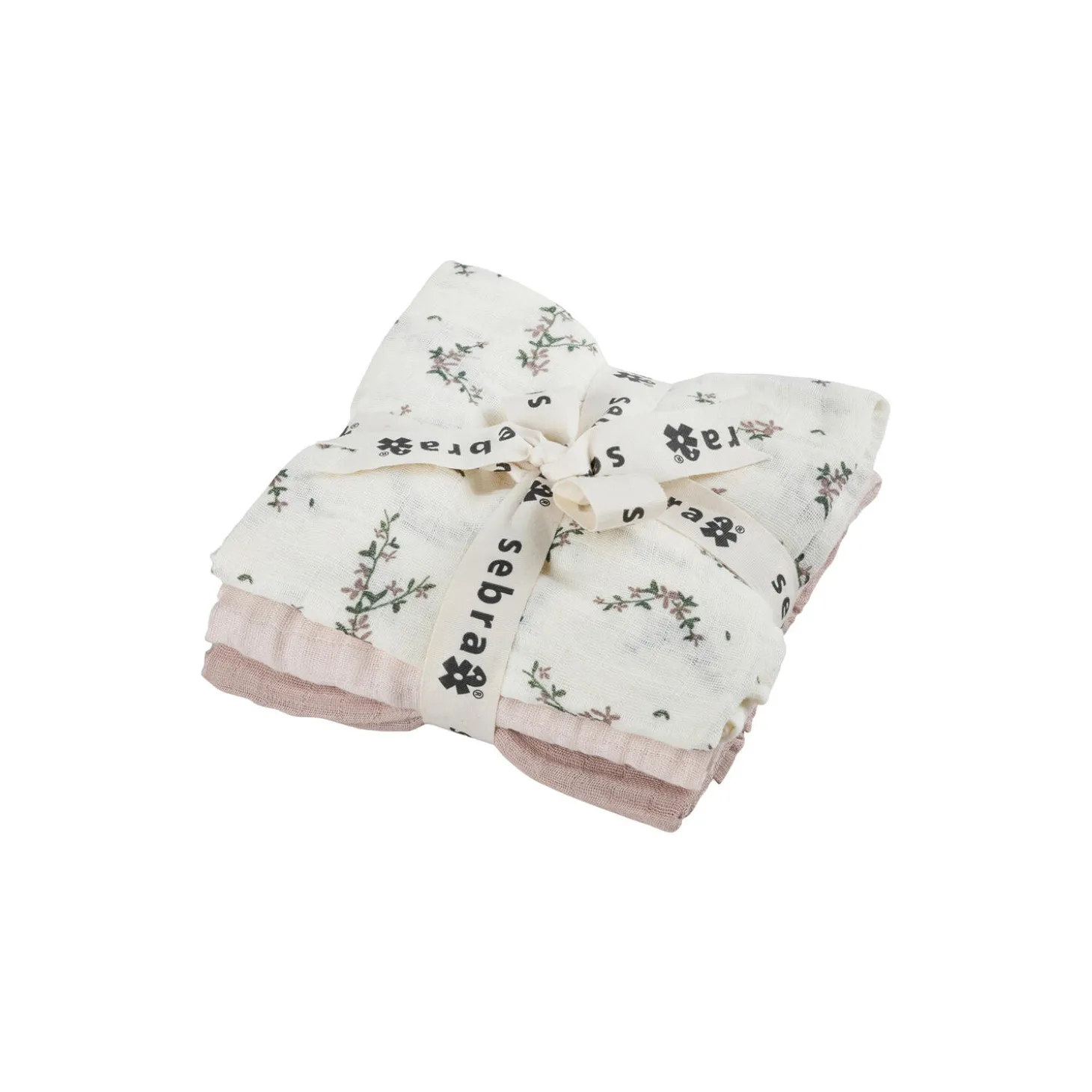 Sampak, der består af tre stofbleer, som måler 75×75 cm, og er fremstillet af økologisk musselin-bomuld. Pakken består af to ensfarvede stofbleer i matchende nuancer og én i Sebra-printet Powder blossom.