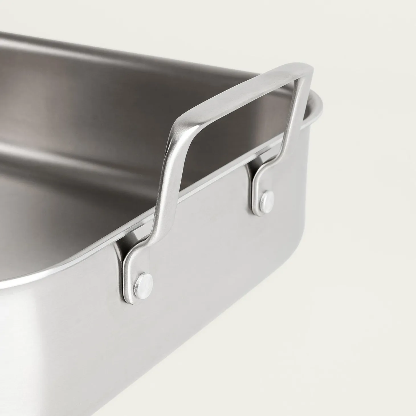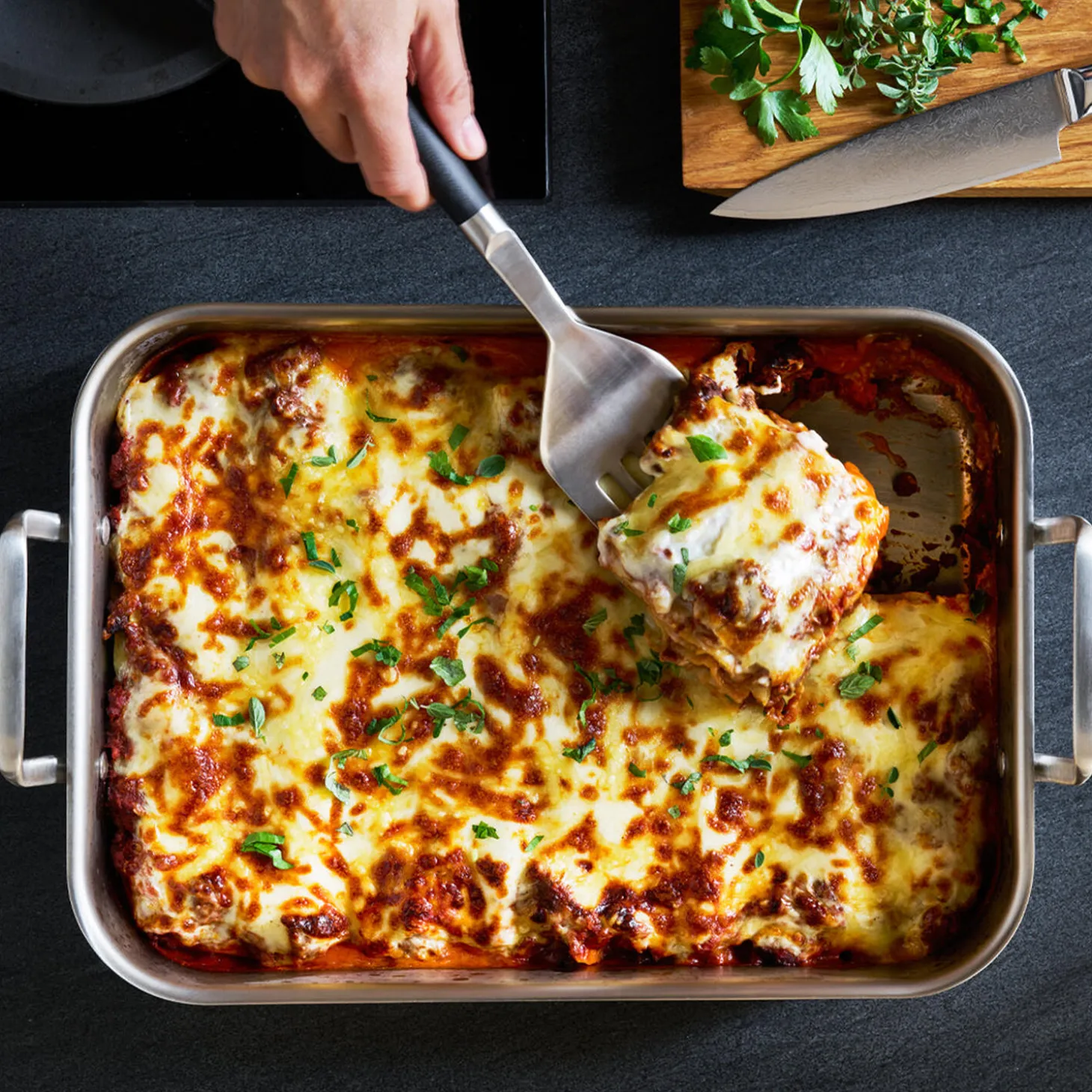 Med 5-ply får du en uopslidelig bradepande, der holder hele livet med alle fordelene ved rustfrit stål: lav vedligeholdelse, egnet til alle typer madlavning, og så slipper du for PFAS og andre former for skadelige belægninger, der bliver slidt af med tiden og ender i maden. Ligesom resten af Gastrotools’ 5-ply-serie er bradepanden håndlavet i Italien på et familieværksted med over 130 års ekspertise, der omhyggeligt producerer hvert stykke køkkenværktøj. Håndtagene er specielt designet til at give et ergonomisk greb og lettere håndtering, selv når du står med en tung bradepande i hænderne. Den rummelige bradepande giver en jævn og hurtig varmefordeling på grund af konstruktionen i fem lag – så uanset om du skal lave lasagne, bage focaccia eller tilberede rodfrugter i ovnen, får du et lækkert, ensartet resultat. Brug og pleje: Tåler opvaskemaskine og ovn op til 300 grader.