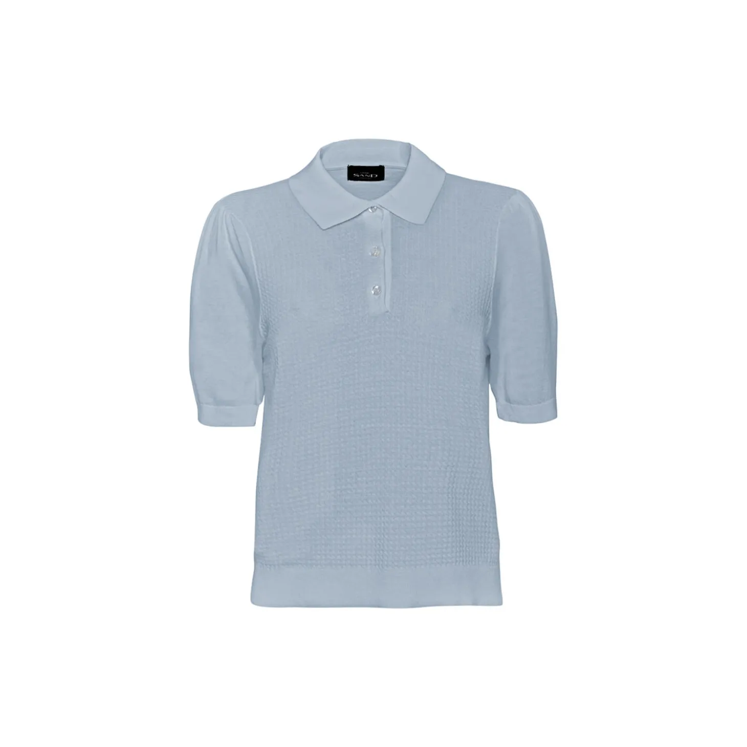 Short sleeve polo with polo collar and 3 buttons closure. Retro knitting pattern on front panel. Puffed short sleeve