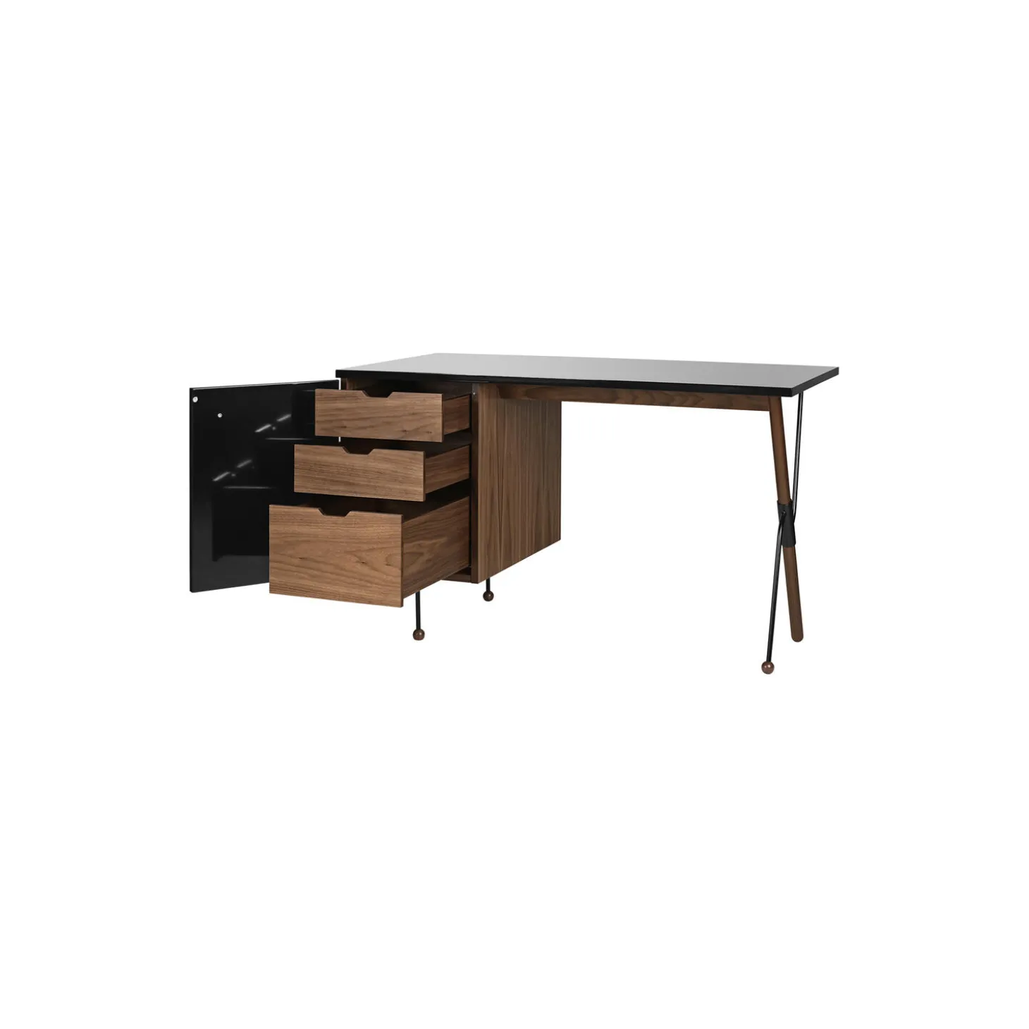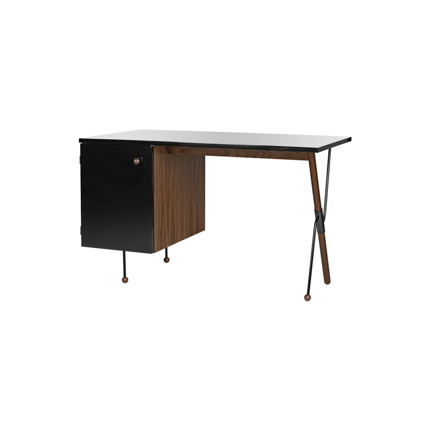 62 Desk i amerikansk valnøddetræsfinér, laminat og pulverlakeret stål fra GUBI. Farve: walnut/black. Mål: H: 72 x L: 120 x B: 60 cm. Design: Greta M. Grossman.