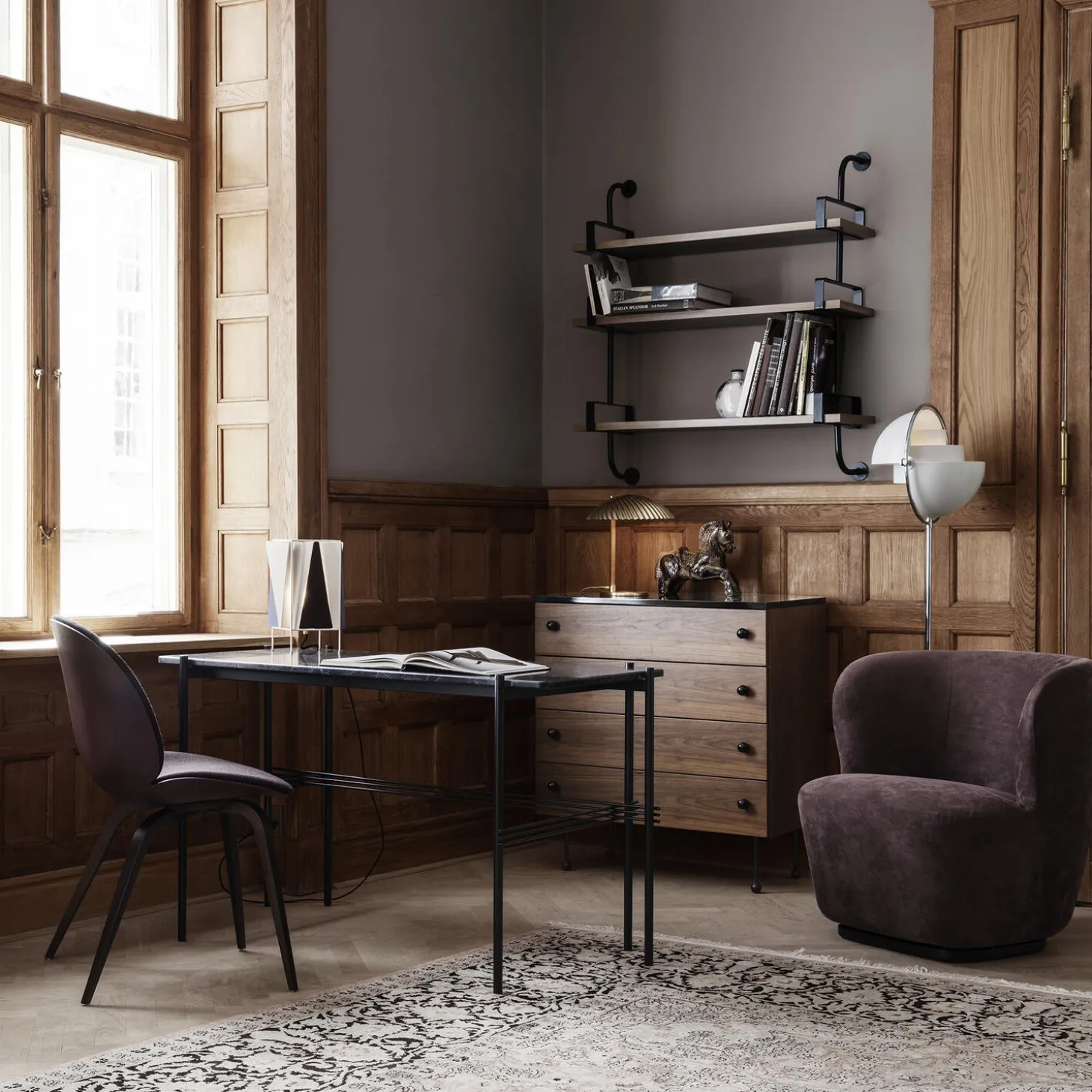 - Materiale: amerikansk valnøddetræsfinér, laminat og pulverlakeret stål