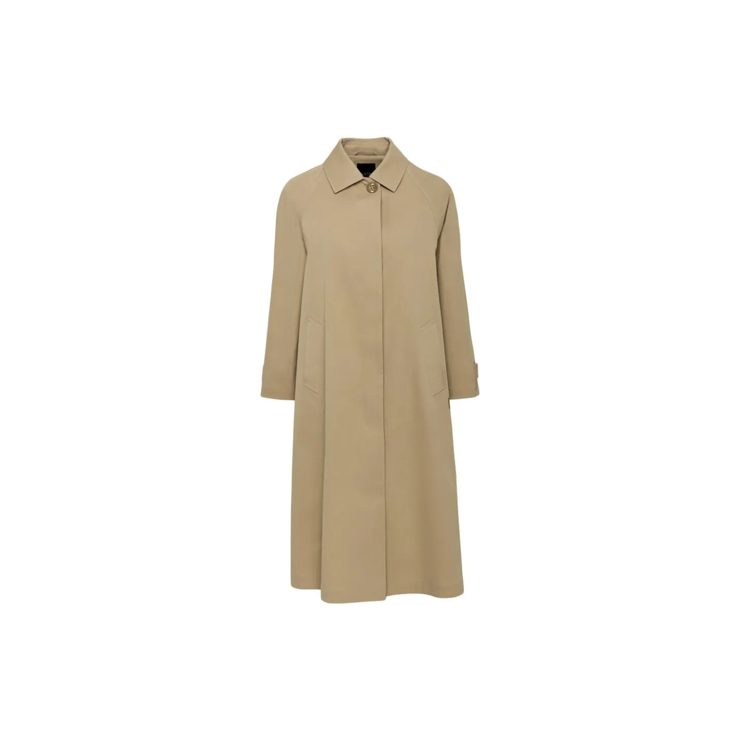 Long coat with regular collar and raglan sleeve. Hidden front button fly and large side pockets