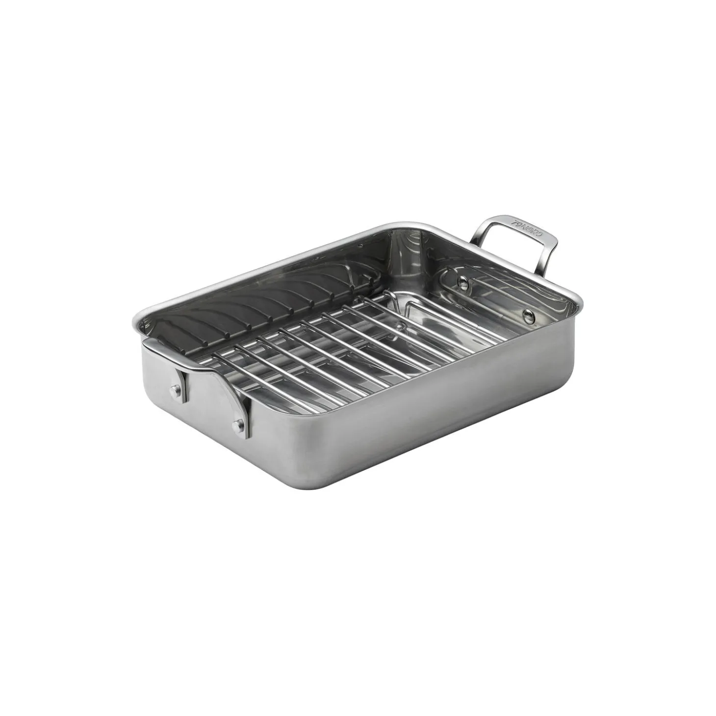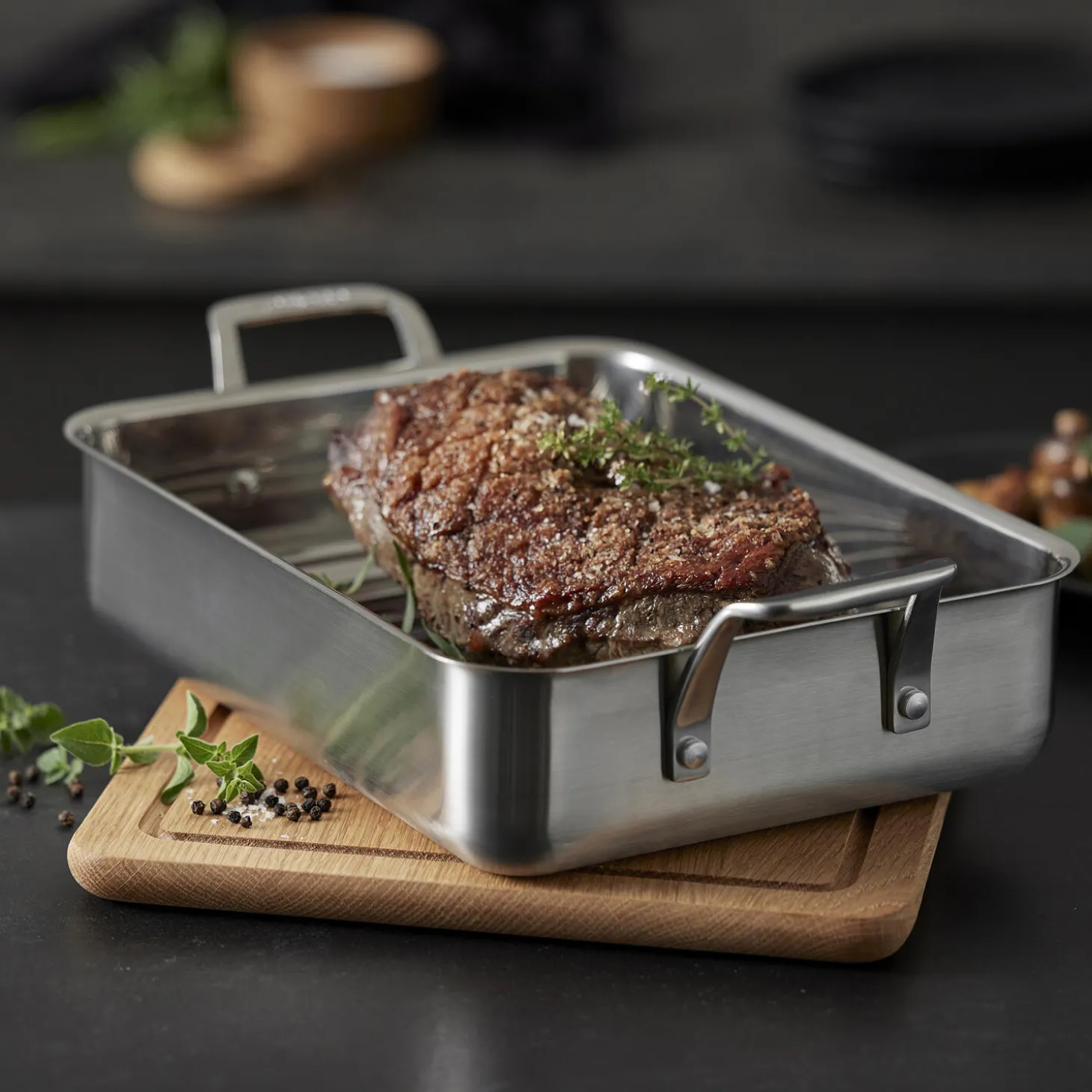 Bradepande af høj kvalitet i rustfrit stål med rist og tyk bund på 1 mm. Bradepanden kan anvendes uden rist til tilberedning af bl. a. kage og grøntsager og med rist til flæskesteg, kylling og meget mere. De opretstående håndtag sikrer, at bradepanden er let at tage fat i og håndtere. Bradepanden måler 40 x 25 x 10 cm inkl. håndtag.