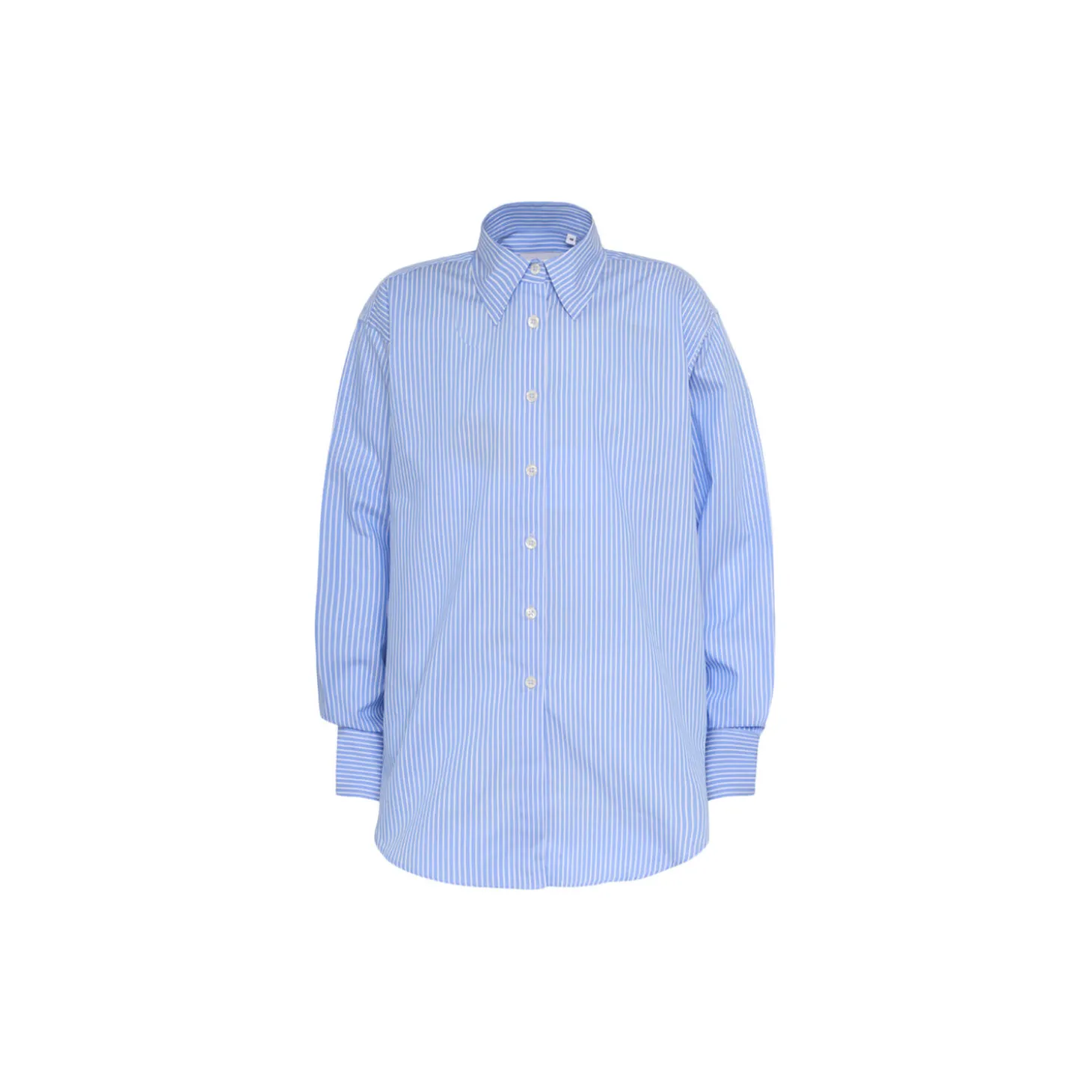 Skjorte med almindelig spids skjortekrave. Langærmet med manchet. Knapet åbning under bærestykket bagpå. Længere bagpanel. Overdimensionerede