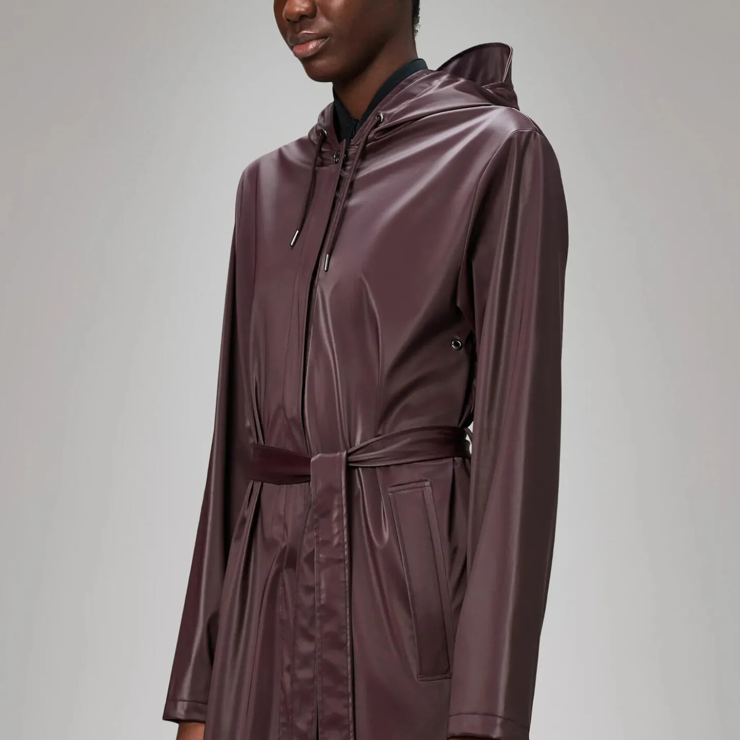 A-line Jacket Longer is a women’s raincoat characterized by its A-shaped silhouette and belt that elegantly accentuates the waist. This jacket is a longer version of Rains’ A-shaped womens raincoat. It features a drawstring hood with built-in cap, side pockets, hidden snap buttons for closure and adjustable snap cuffs. A-line Longer Jacket is completed with a belt to accentuate the waist for an individually fitted silhouette. The finish is soft with a lightweight feel and elegant drape. This waterproof women’s coat is cut from Rains’ signature PU fabric and features welded seams making the jacket both resistant to water and wind. Underarm eyelets ensure ventilation for breathable comfort.
