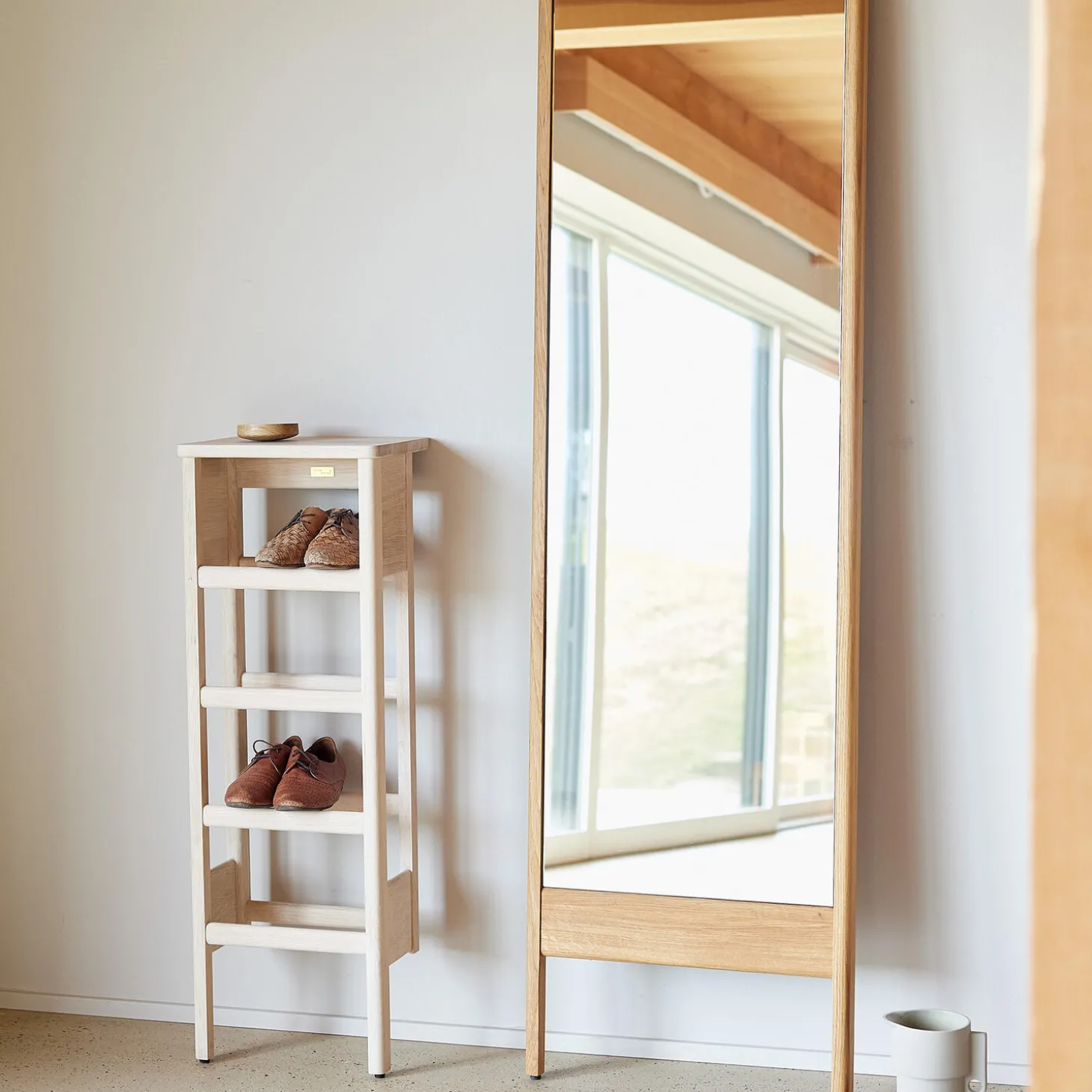 Skohylden A Line er en praktisk opbevaringsløsning i et harmonisk design, der kombinerer skohylder med et konsolbord, der udnytter den begrænsede plads i gang, bryggers eller entre. Møblet er fremstillet af bæredygtigt egetræ af højeste kvalitet med afrundede linjer i en videreføring af stolte kunsthåndværkstraditioner. Den store hylde øverst fungerer som konsolbord. Hver hylde har plads til et par sko, så møblet rummer fire par sko i alt. Vi anbefaler, at møblet fæstnes til væggen med de medfølgende metalbeslag, men det kan også lænes mod vægen uden at blive fastgjort.