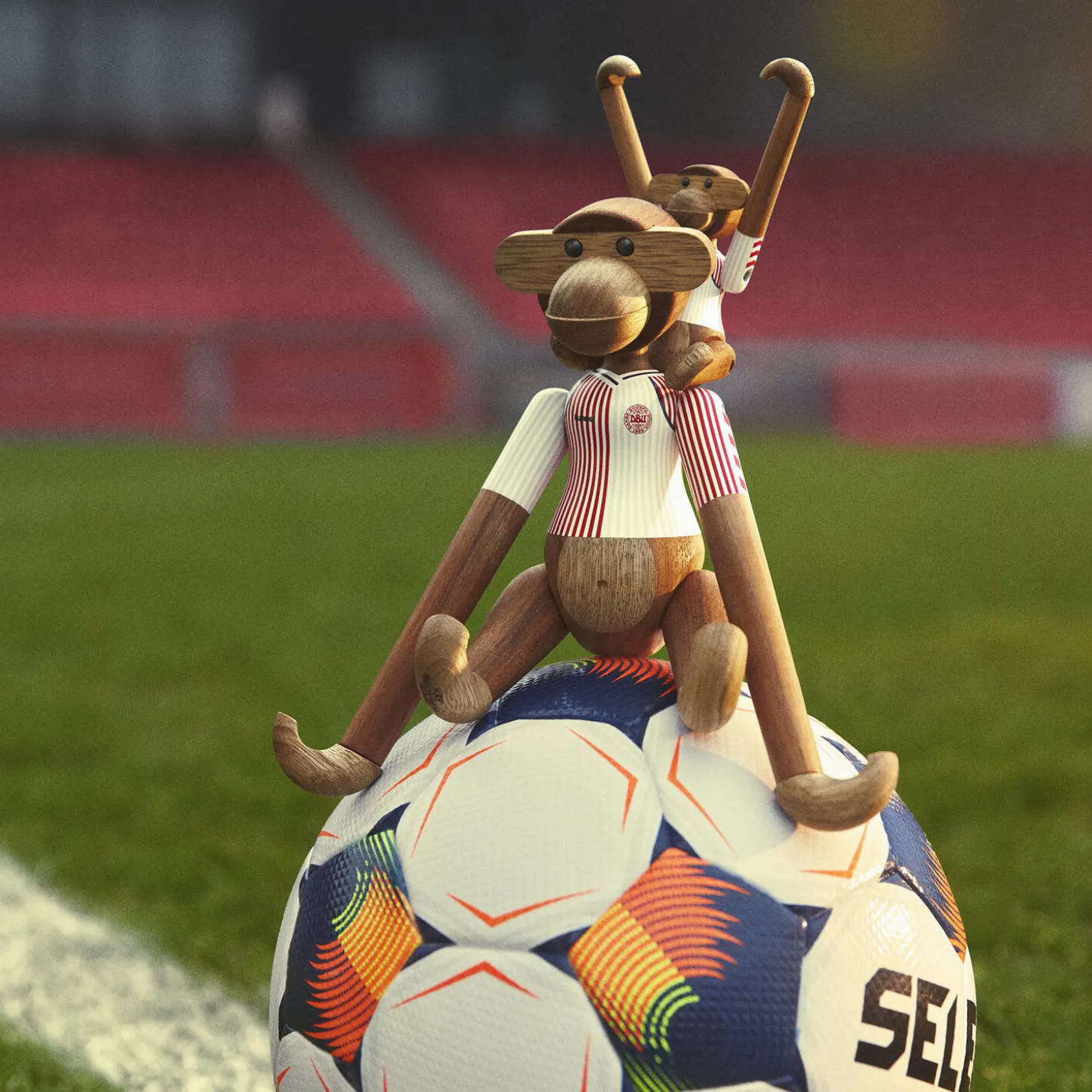 Ny holdkammerat til alle i rødt og hvidt. Med Kay Bojesen Abe x DBU er to af de største danske nationalikoner gået sammen for med humor, kreativitet og det gode håndværk at hylde sammenholdet og stoltheden over at stå sammen side om side fra leg til landshold. Og i 2025-udgaven af Kay Bojesen Abe x DBU tager vi sammen et nostalgisk skridt tilbage i tiden i en mindeværdig fejring af den ikoniske danske fodboldtrøje fra epoken omkring VM-slutrunden i Mexico i 1986. Du husker sikkert trøjen karakteriseret ved sit enkle og alligevel meget genkendelige todelte design med tætte striber i to forskellige kontraster, hvor den ene side næsten virker fuldfarvet med striber i samme farvenuance, mens den anden side har en mangfoldighed af tynde røde og hvide striber. Lige præcis den retrotrøje der altid vil fremkalde uforglemmelige minder om Herrelandsholdets gennembrud på den internationale scene. Et værdsat symbol for både fodboldfans og designentusiaster. Trøjedesignet er skabt af hummel, og for mange danskere repræsenterer denne enestående fodboldtrøje ikke bare en hyldest til en svunden tid. 86-trøjen er også en forbindelse til den nationale identitet og stolthed, som mange oplevede, fordi VM i Mexico var en skelsættende turnering for Danmark, hvor Herrelandsholdet i den grad trådte ind med et varigt aftryk på fodboldens verdenskort. Derfor fungerer trøjen også som et symbol på fællesskab og national stolthed, der bringer mennesker sammen i deres kærlighed til sporten – og hinanden. Lige nøjagtig det som samarbejdet mellem Kay Bojesen og DBU handler om, nemlig vigtigheden af at bevare og fejre dansk kultur og historie, samtidig med at fans – både fodboldfans og designfans – får mulighed for at få del i et eksklusivt stykke af denne arv ved at lade et måske endnu mere verdensberømt ikon inden for dansk design bære den med stolthed. Kay Bojesen Abe x DBU med denne fuldstændig legendariske landsholdstrøje produceres kun i 2025. Og når nu det er selveste Kay Bojesen Aben, der tager den på, så gør det jo heller ikke noget, at 86-trøjen i fodboldkredse fortsat anerkendes som en af de flotteste fodboldtrøjer nogensinde og har vundet flere internationale priser som en af fodboldhistoriens mest ikoniske trøjedesigns. Du kan få Kay Bojesen Abe x DBU i 2025-versionen i to størrelser. Du bestemmer selv, om det skal være denne lille udgave på 18,5 cm i højden eller den lidt mindre fodboldfan på 9,5 cm, som du inviterer indenfor – eller måske dem begge. Såvel lille som mini de er iklædt Herrelandsholdets flotte 86-udebanetrøjer malet med stor omhyggelighed og påført med print med største præcision ned til de mindste detaljer, så trøjedesignet står så tæt som muligt på originalen og smukt fortolket i tråd med figurhistorien med det autentiske og gennemarbejdede udtryk fuld af den sjæl og humor, der altid har været udgangspunktet for Kay Bojesens unikke håndværk og historiefortælling. Begge størrelser kommer i det klassiske mix af FSC®-certificeret teak og kontrolleret limbatræ. Med det fortsatte samarbejde med DBU videreføres Kay Bojesens originale fortællinger i træ med et nyt kapitel om fodbold og fællesskab, der ydmygt og med et glimt i øjet skriver videre på en legendarisk og spillevende designarv.