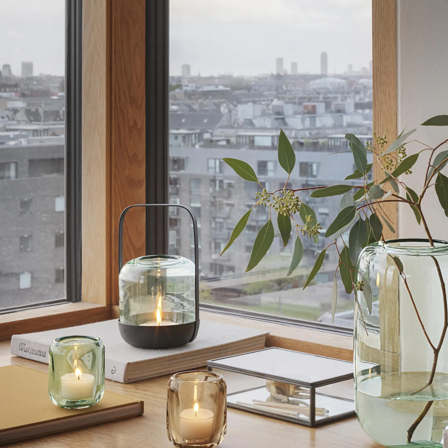 Lad hyggen sprede sig både inde og ude med den elegante og dekorative Acorn lanterne. Med sit praktiske greb i pulverlakeret stål er lanternen lige til at tage med sig, f.eks. ud på terrassen. Glassets sarte Mint-nuance er inspireret af den rå natur omkring os. Lanternen tændes nemt ved blot at løfte glasset og passer til fyrfadslys i standardstørrelse. Glasset tåler maskinopvask. Pulverlakeret stål: rengøres nemt med en opvredet klud.