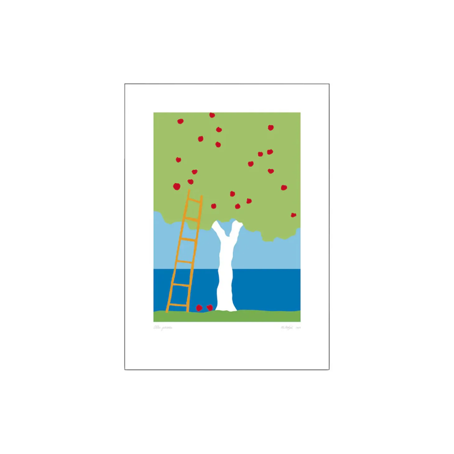 Kunstplakaten er en reproduktion af det originale kunstværk Æbler plukkes, som blev serigrafitrykt i 1983. Dejlige store æbler, saftige og røde.