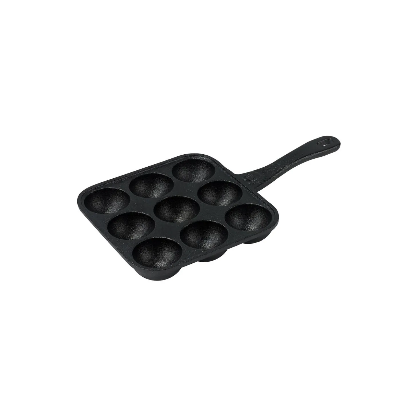 Æbleskivepande m. 9 huller i støbejern. Også god til frække torskedeller, frikadeller, muffins, lasagne on kop & falafel – kun fantasien sætter grænser.33 x 19 x 4,5 cm.