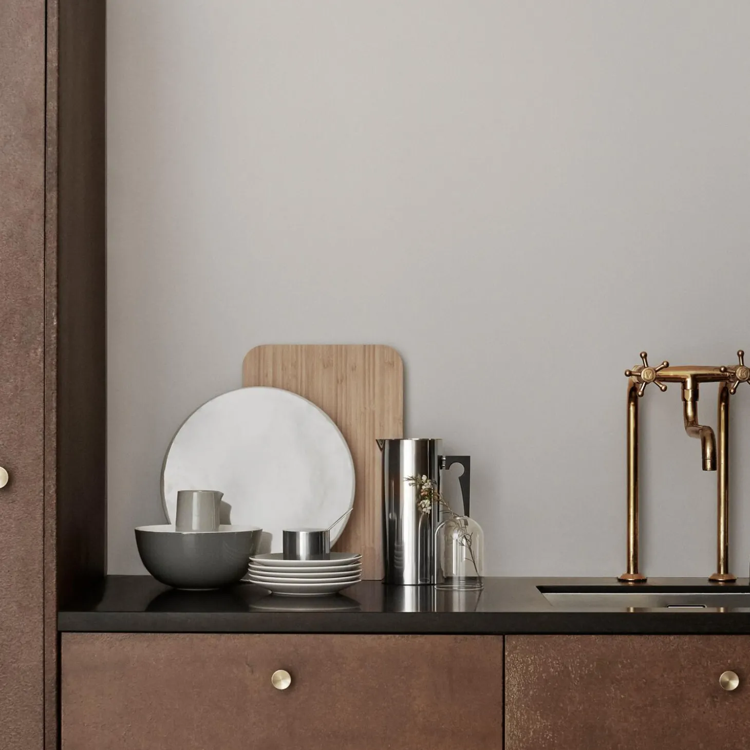Arne Jacobsens kande med rist fra Cylida-line serien er funktionelt design til hverdag og fest. Kanden i rustfrit stål rummer 2 liter og har en smart rist, som holder isterningerne i kanden og vandet koldt. Kandens sorte hank af bakelit ligger godt i hånden og er placeret med den ideelle hældevinkel.