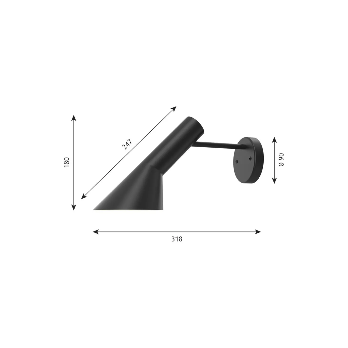 AJ væglampe uden afbryder & ledning i vådlakeret optrukket stål fra Louis Poulsen. Farve: black. Mål: H: 18 x L: 31,8 x B: 14,5 cm. Lyskilde: maks. 20W E14. Design: Arne Jacobsen. Arne Jacobsen designede blandt meget andet dette armatur til SAS Royal Hotel i København i 1957. Væglampen giver et behageligt nedadrettet lys med sin hvidlakerede inderskærm. Desuden kan skærmen vippes for at justere lysfordelingen. AJ-lampefamilien anses for at være Arne Jacobsens mest kendte design på globalt plan. Bortset fra AJ Væg bestod AJ-familien også af en bordlampe, en mindre bordlampe, en gulvlampe samt en bordmonteret lampe, der alle kunne findes på SAS Royal Hotel efter indvielsen i 1960. AJ-lampens karakteristiske rene form med dens perfekte lys kunne ses rundt omkring på hotellet i versioner i både kobber og rustfrit stål. Sammen med AJ Royal var AJ-lampen en del af det overordnede designkoncept, som Arne Jacobsen skabte til hotellet. Han designede nærmest alt selv. Parallellerne mellem de lige linjer og kombinationen af lige og buede vinkler i AJ-lampen kan også ses i de geometriske konturer på flere af hans bygninger.