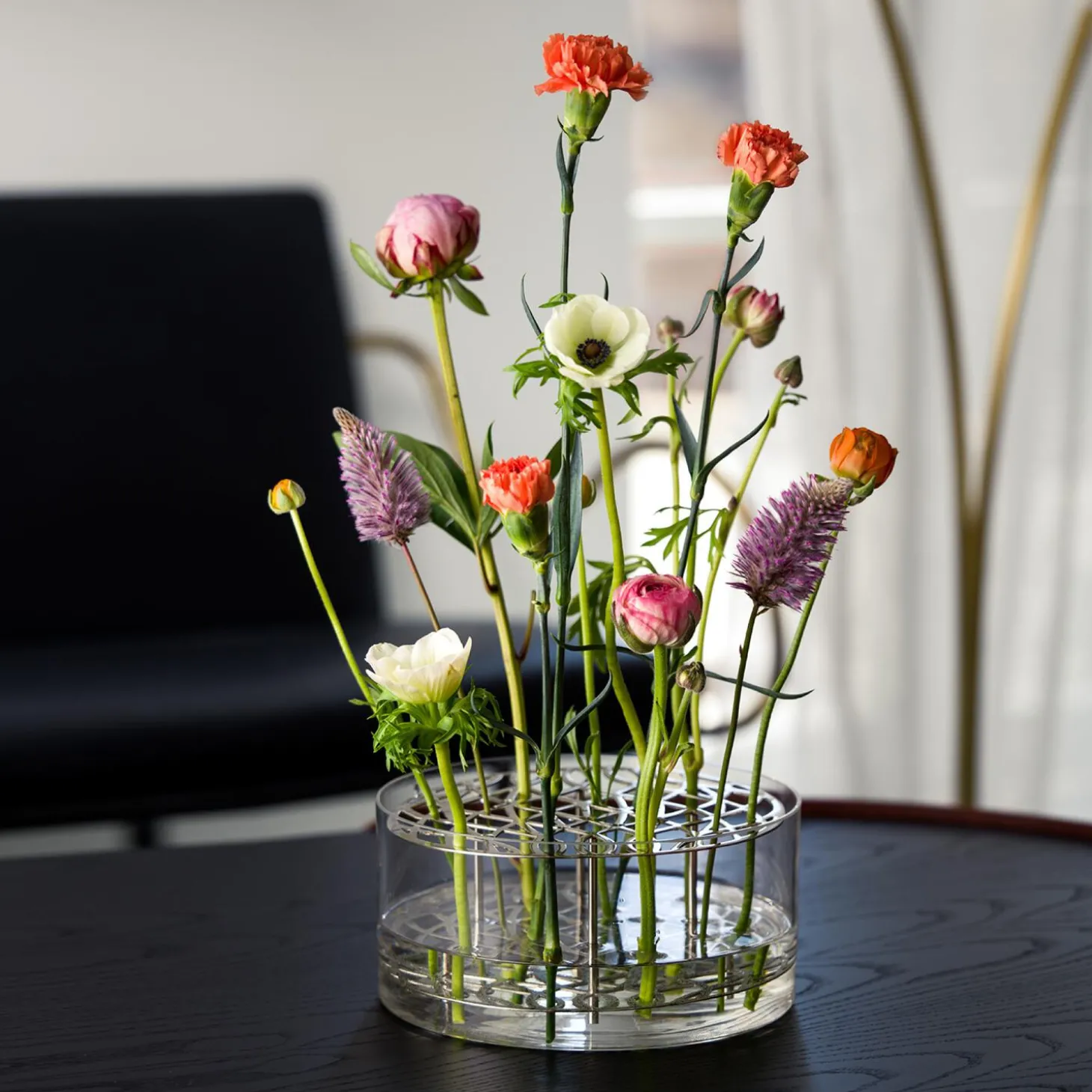 The idea of Äng is to give each individual flower support to stand by itself. The vase has a metal insert with a beautiful pattern, which makes it a piece of art. The structure lets the flowers fall into place and create a nice and organized flower decoration. The vase is mouth blown clear glass from Böhmen, Czech Republic and the insert is available in brass, black, blue/green and silver plated.