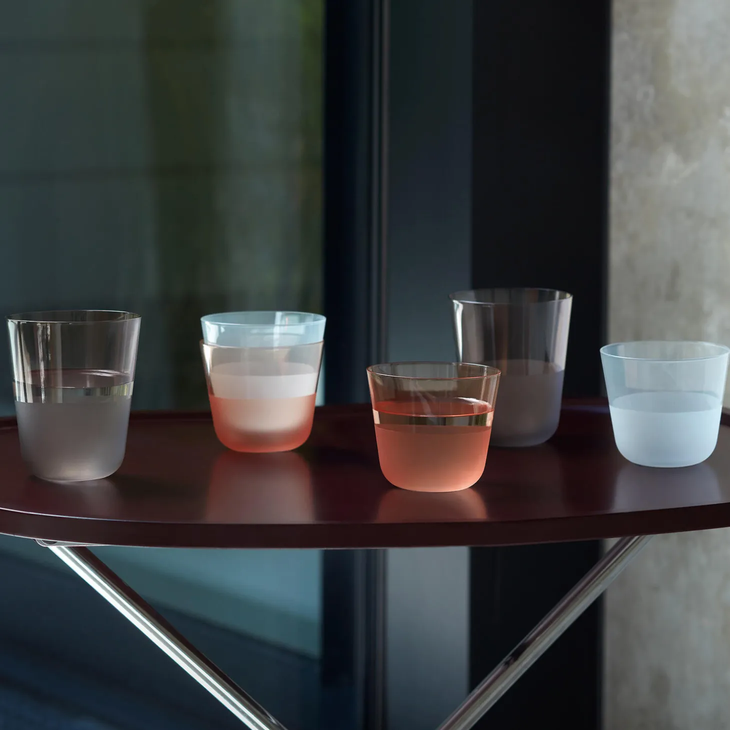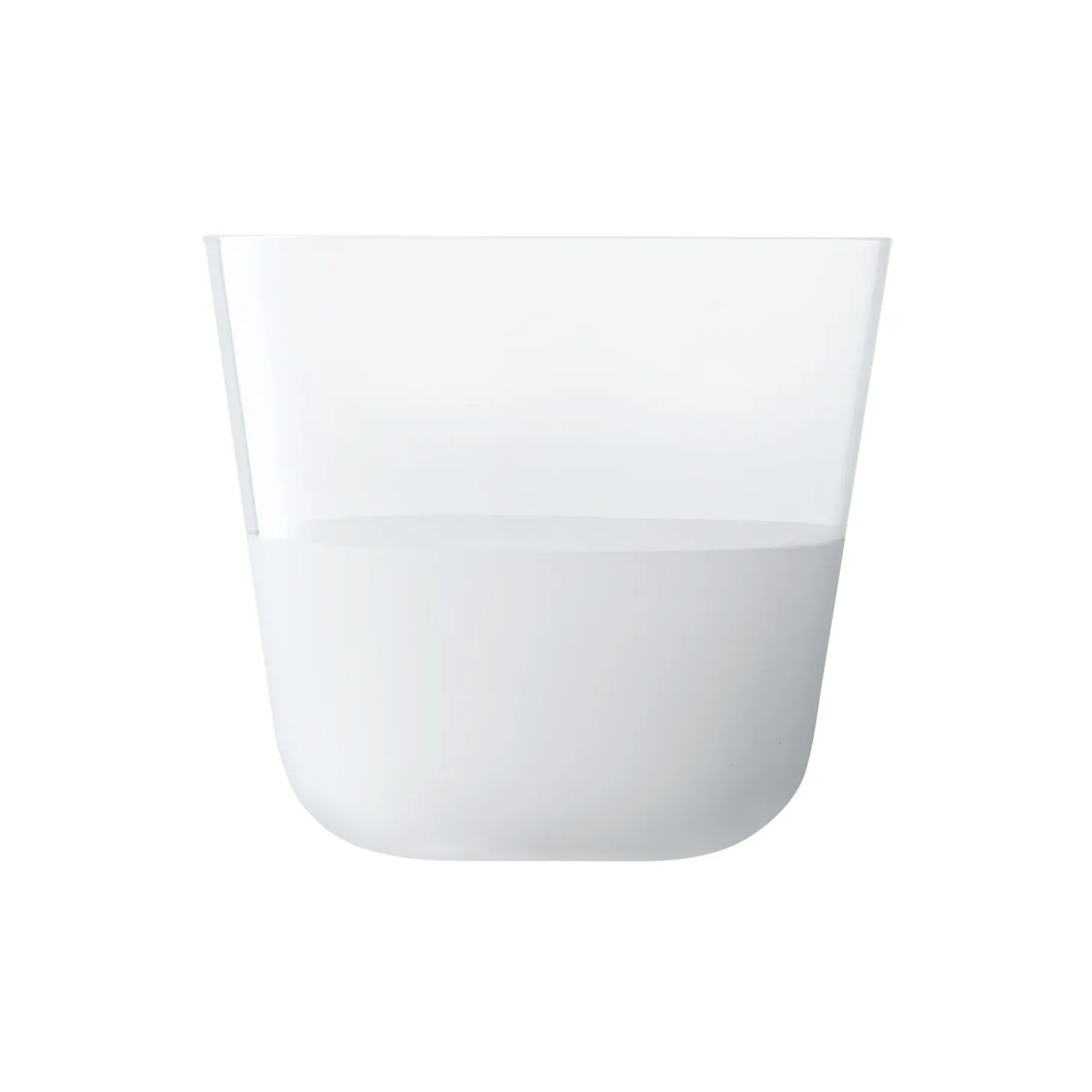 Et sæt af to glas med afrundede bunde, blødt tilspidsede profiler og en mat tekstureret finish på den nederste halvdel. En alsidig form til vin, vand og korte cocktails. Fremstillet af soda-lime glas for klarhed og styrke, og designet til hverdagen. Økologisk fareve, stabelbar og tåler opvaskemaskine.