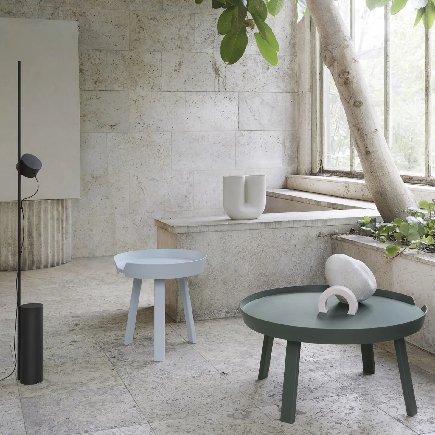 Around Coffee Table from Muuto. The Around Coffee Table brings a new perspective to its typology through the characterful wooden veneer frame that runs along the edge of the table, echoing the ideas of Scandinavian design. With its round shape and multiple sizes, the Around Coffee Table can be used in a multitude of settings.