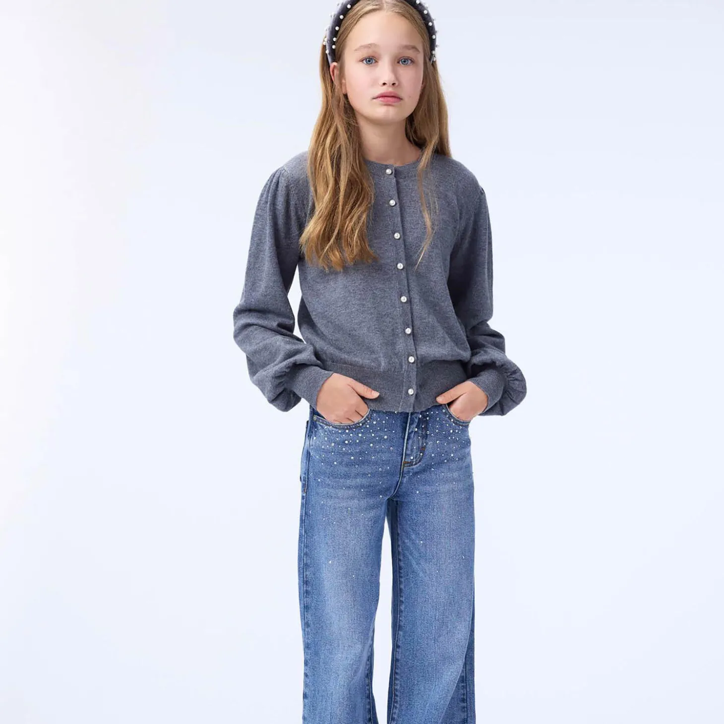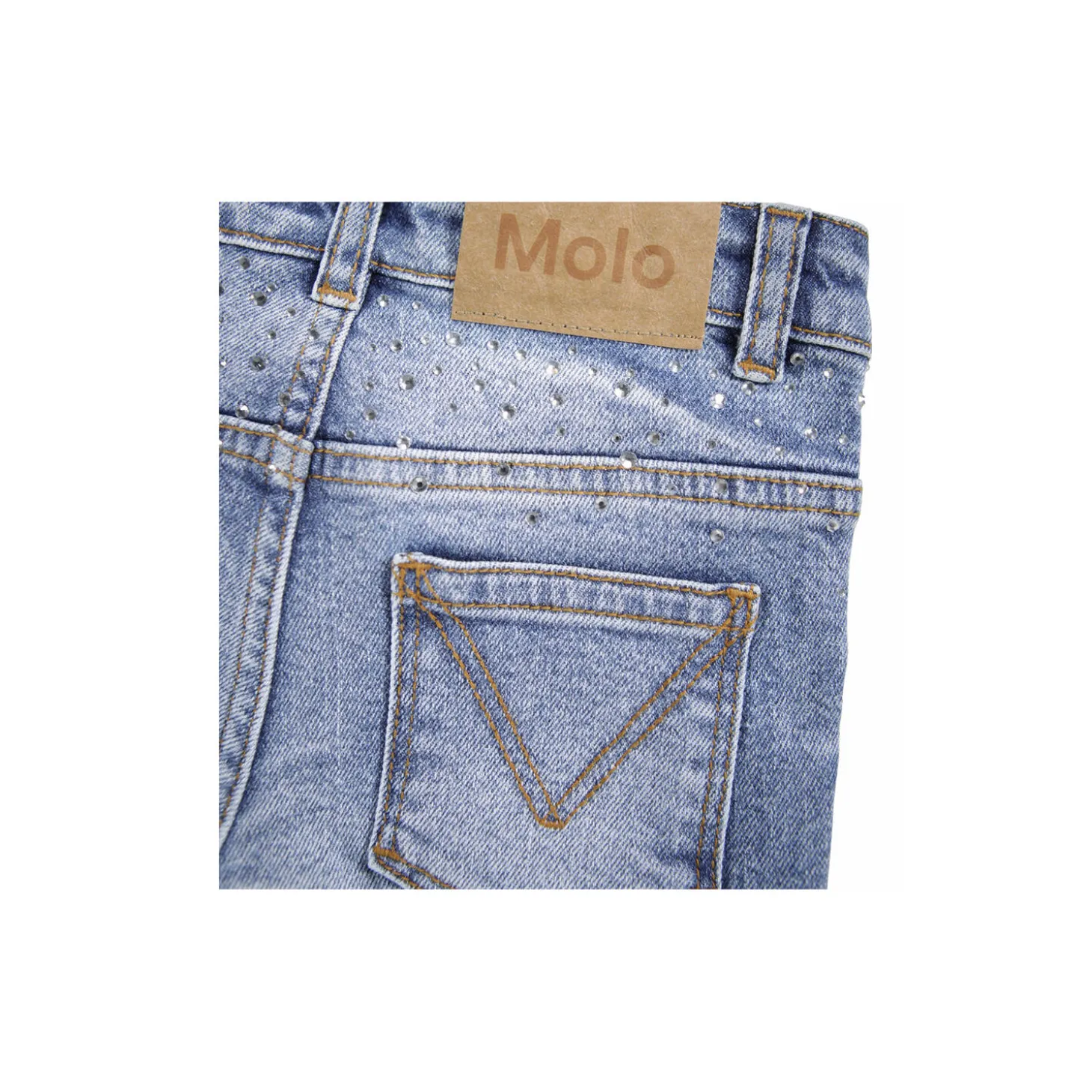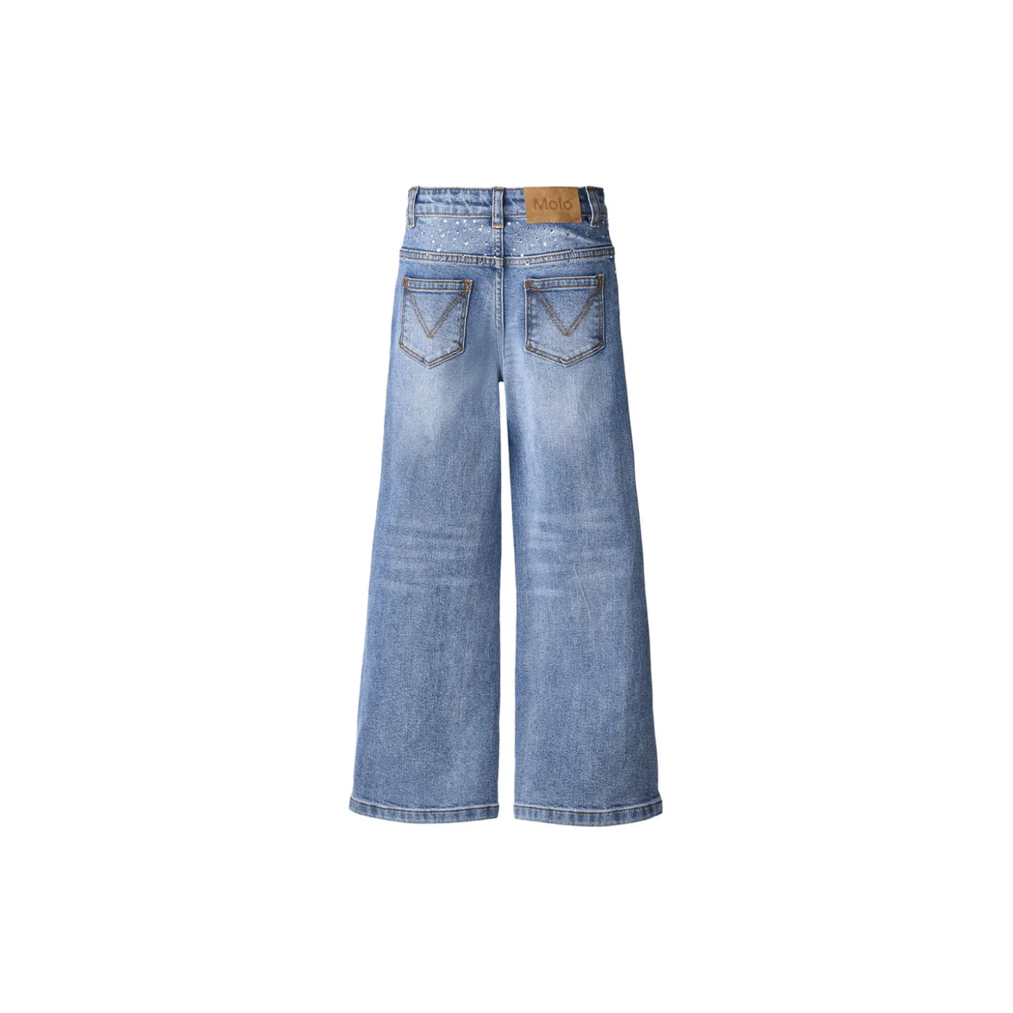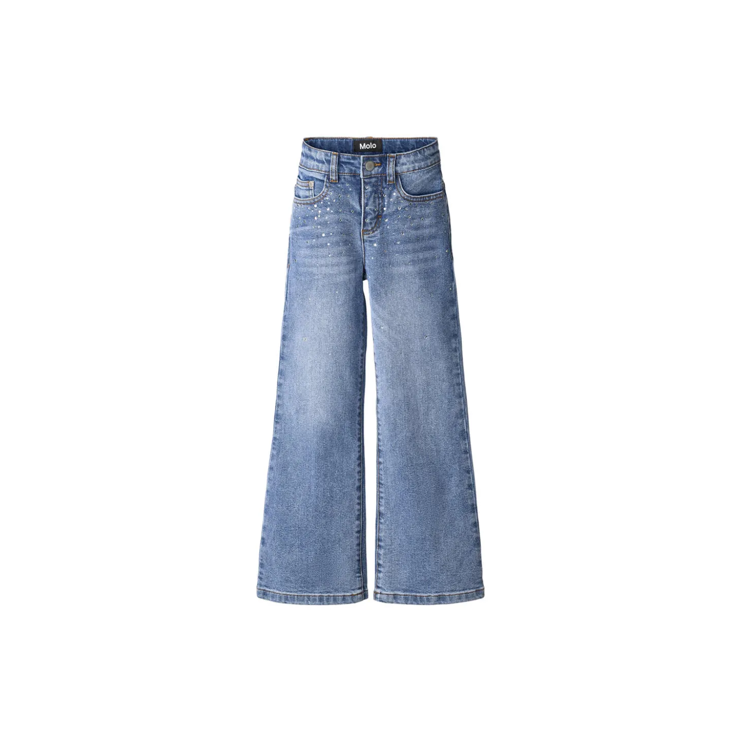 Jeans lavet af økologisk bomuld med stretch, og har 5 lommer, brede ben og en almindelig pasform. Bukserne er pyntet med similisten både foran og bagpå. Livvidden kan justeres med en indvendig elastik for optimal pasform til alle børn. Størrelser 92-134 har trykknap, mens størrelser 140-176 har en almindelig jeansknap.