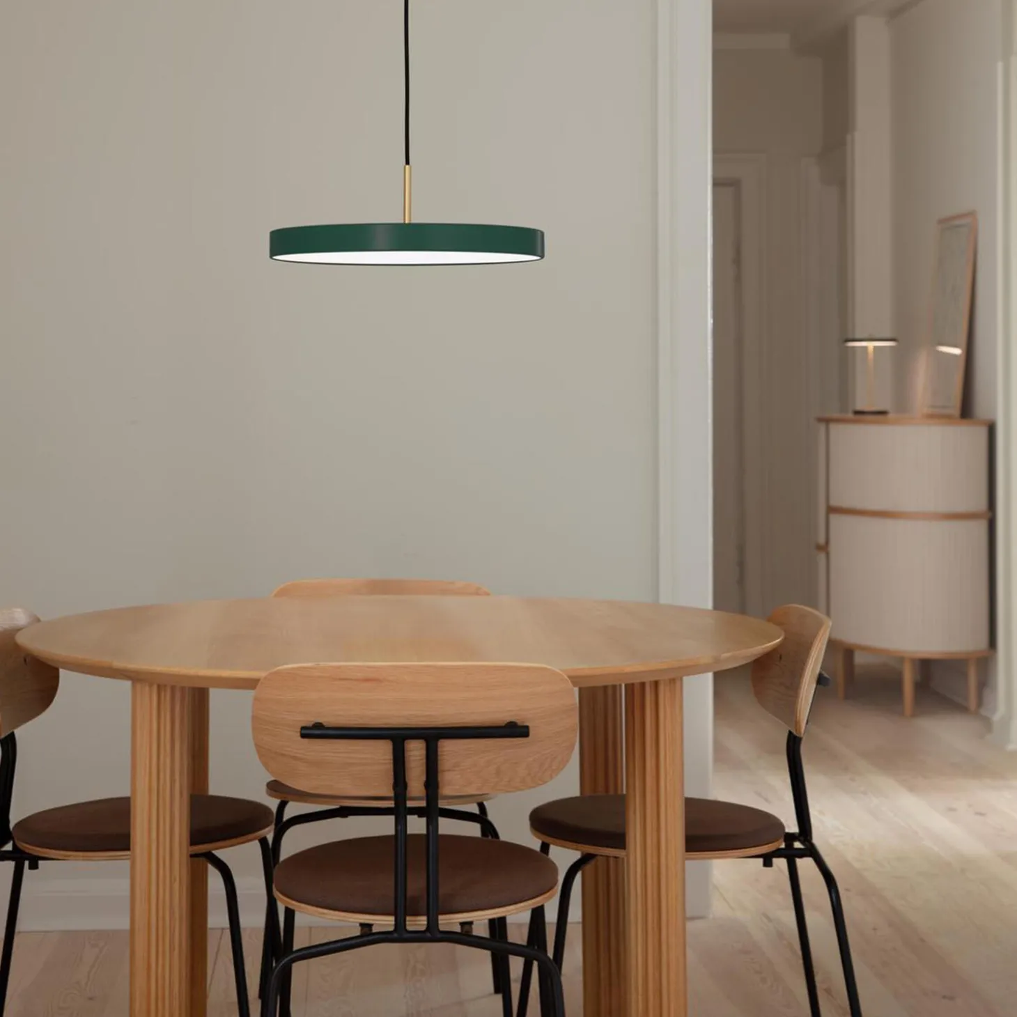 The Asteria Plus takes the classic Asteria pendant lamp to new heights by offering a built-in dimmer and compatibility with track lighting, making it perfect for the office, private dining settings or kitchen areas. It combines functionality and versatility, catering to the needs of spaces where adaptability and style are of utmost importance.The Asteria Plus pendant lamp’s sleek appearance and clean lines represent minimalistic beauty, while a built-in LED panel infuses the space with soft and timeless illumination. With a hidden button by the lamp’s top, you can effortlessly adjust the light temperature to create the perfect atmosphere, whether it be for focused work or a relaxed ambience. The lamp is dimmable with the use of an external dimmer. Asteria Plus is in a variety of different colours in medium and mini and features a brass top that can easily be interchanged with steel or black, providing endless design possibilities that align with your personal style.