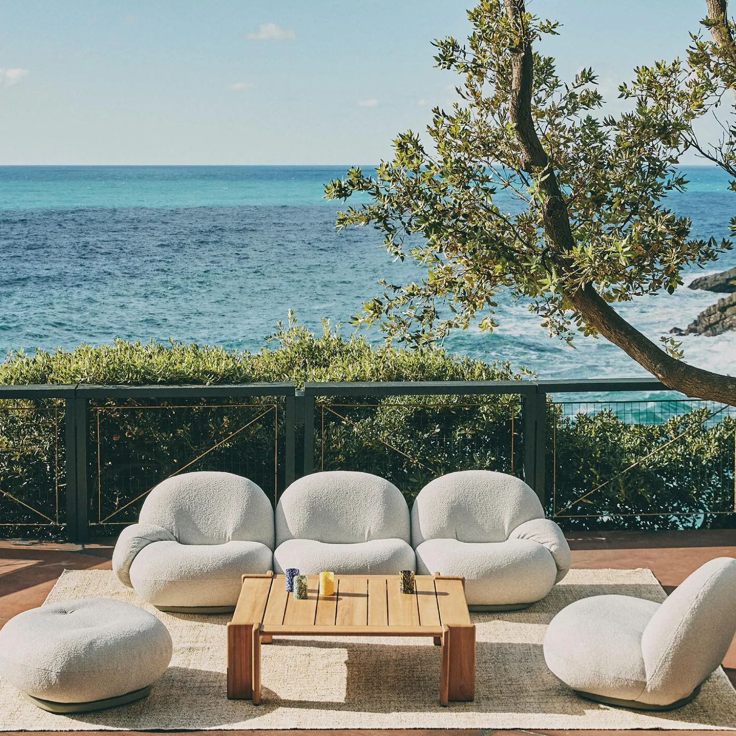 Atmosfera Coffee Table i teak fra GUBI. Farve: teak. Mål: H: 35,5 x L: 113 x B: 100 cm. Design: The Gubi Design Team.