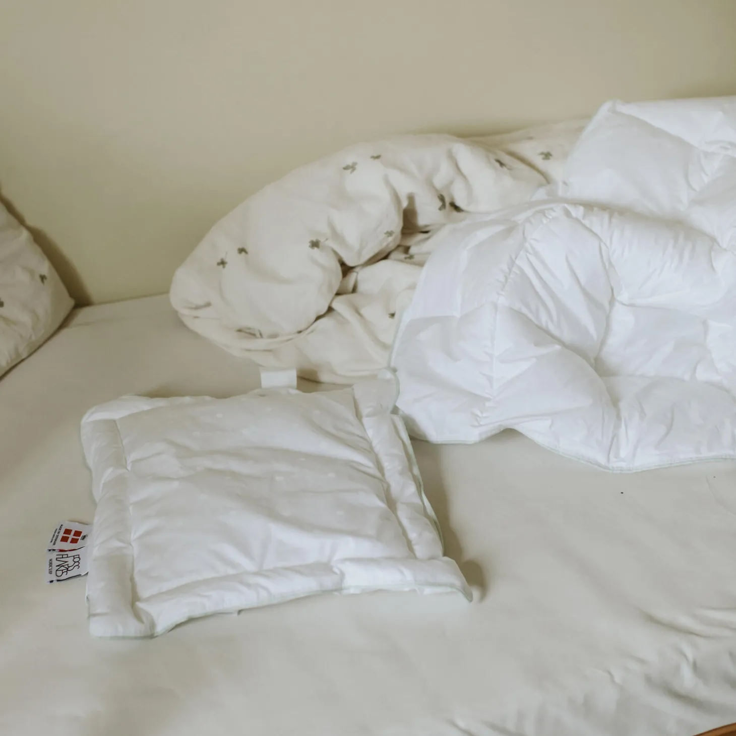 Fossflakes puder og dyner til baby er udviklet med tanke på den sunde, trygge og komfortable søvn. Fossflakes Babypude og dyne føles naturlig blød og behagelig. Luftlommer i fyldet lader luften cirkulere om kroppen og sørger for at dit barn holder en behagelig temperatur natten igennem.Babysættet er nemt at vedligeholde og bevarer sin fylde, selv efter hyppig vask. Maskinvaskes ved 60° C og holdes derved fri for støvmider. Brug enzymfrit vaskemiddel og undgå brug af skyllemiddel.Tørrevejledning: Kan tørretumbles på uld eller silkeprogram. Tåler ikke høj varme. Er du i tvivl om din maskine kan overholde varmegraderne, så lad i stedet dit Fossflakes produkt lufttørre.