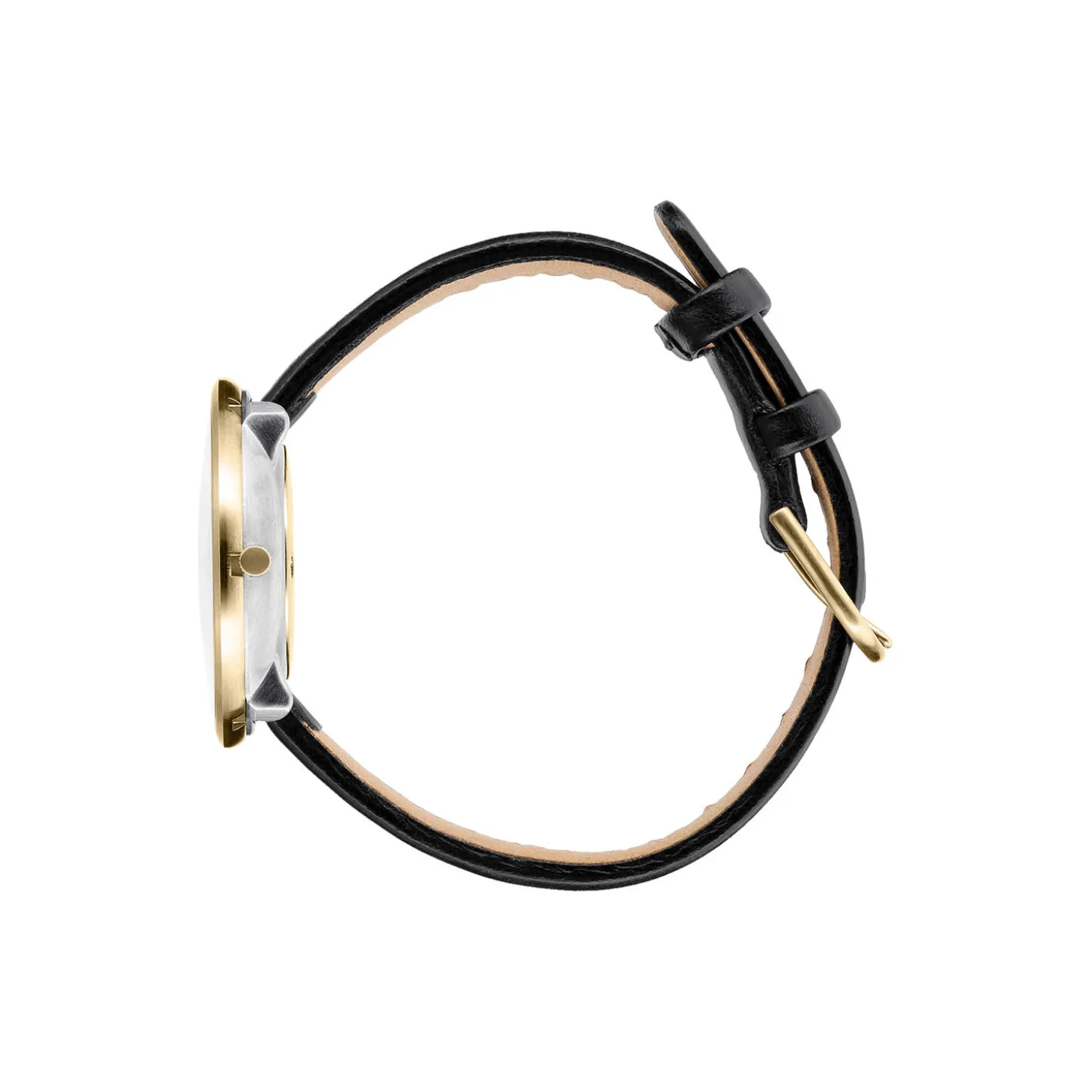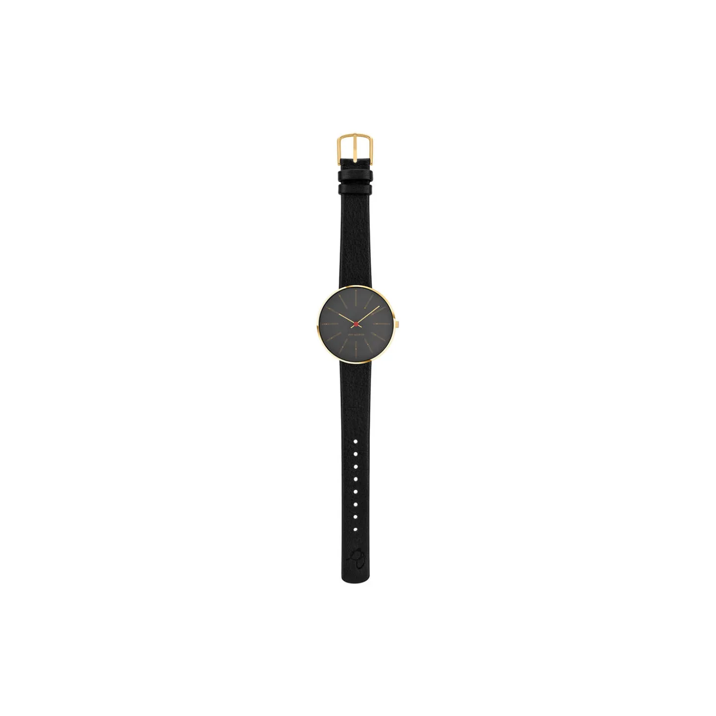 Arne Jacobsen Bankers wrist watch with polished gold 16 mm leather strap in calf-skin with polished gold buckle. The dial on this watch is 34 mm.