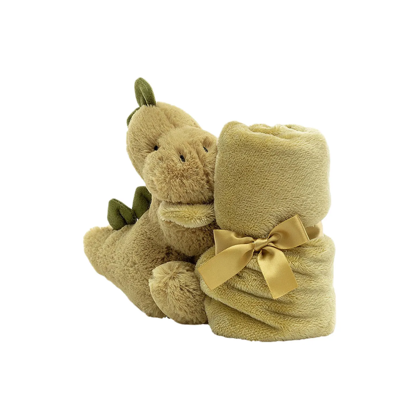 Den lille dino holder godt fast på den bløde nusseklud fra Jellycat. Giv barnet noget blødt og trygt når det skal sove.