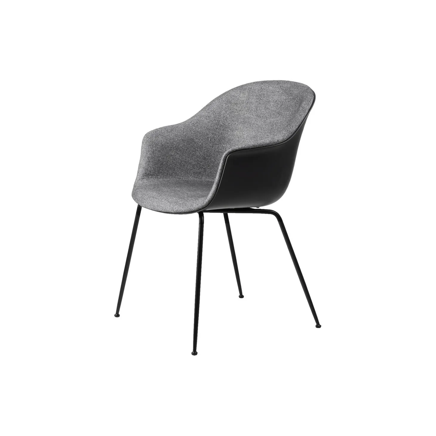 Bat Dining Chair forsidepolstret i Plain 0023 tekstil af Enzo Degli Angiuoni, skal i 100% genanvendeligt PP-plast og stel i lakeret stål fra GUBI. Farve: Plain 0023/black matt. Mål: H: 83 x B: 61 x D: 57 cm. Siddehøjde: 45 cm. Design: GamFratesi.