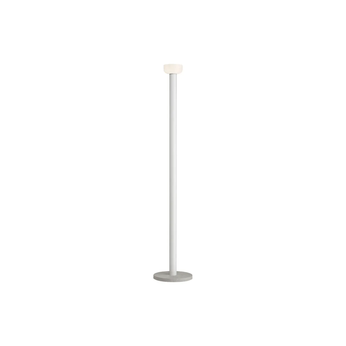 Bellhop gulvlampe i malet aluminium, reflektor i blæst glas og base i cement fra Flos. Farve: white. Design: Edward Barber & Jay Osgerby.