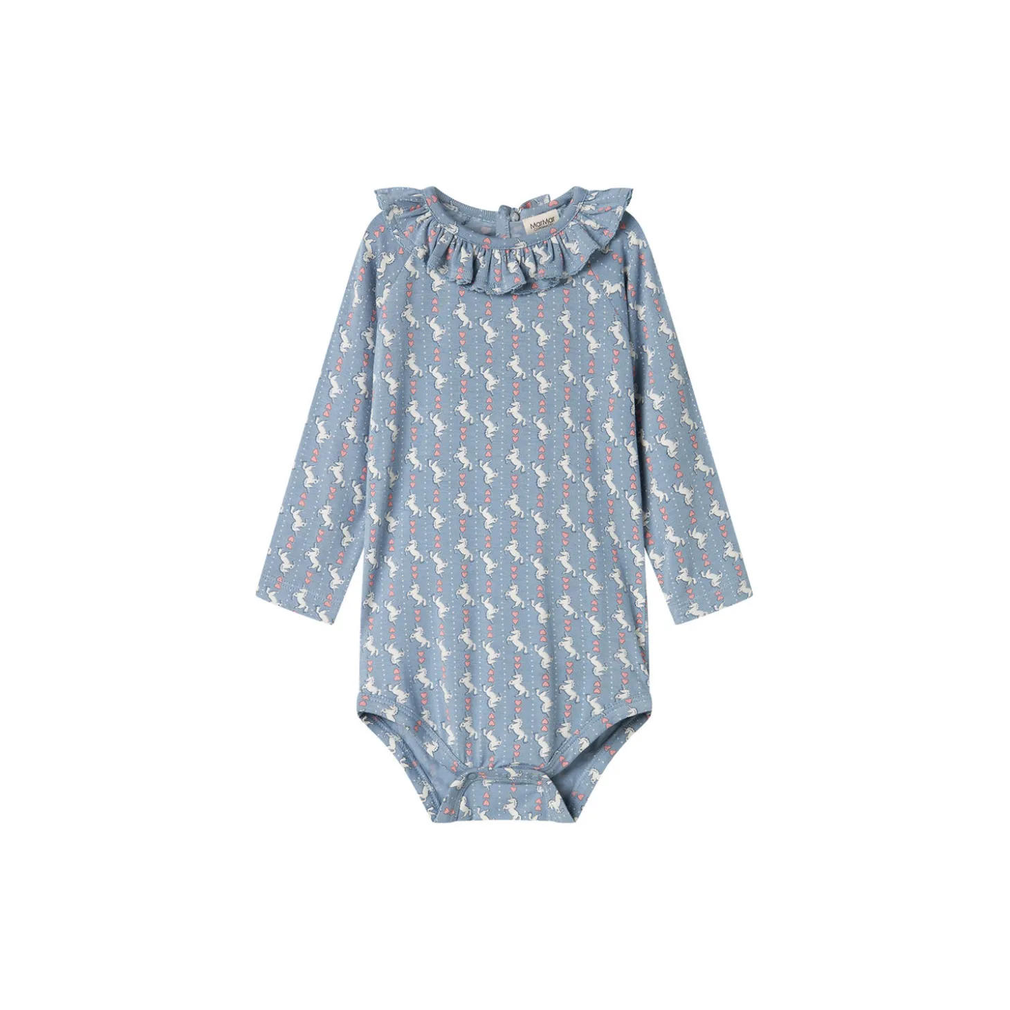 Langærmet baby bodystocking med flæsekrave, der bliver lukket med trykknapper på ryggen samt mellem benene for nem bleskiftning.