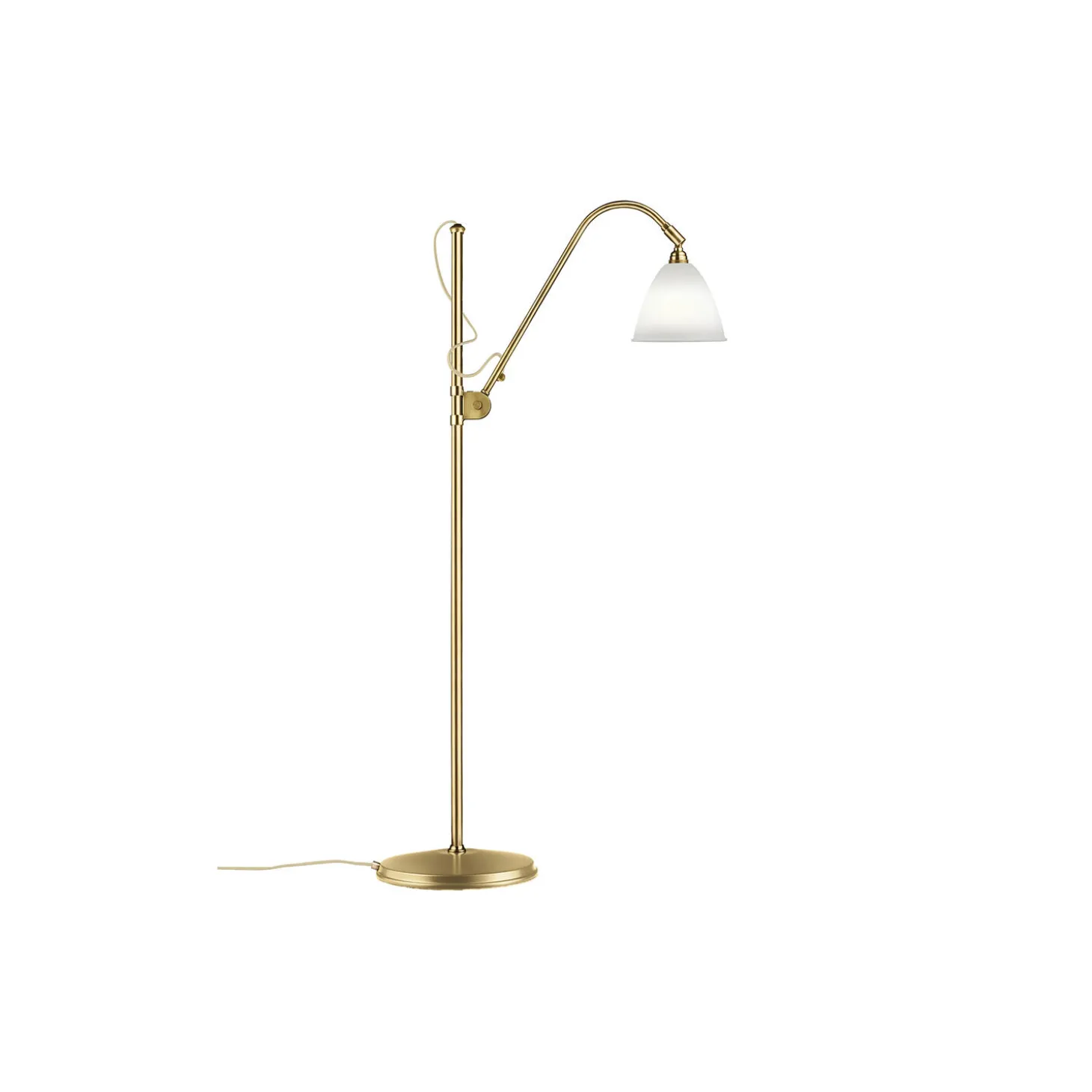 Bestlite BL3 S Floor Lamp med skærm i benporcelæn, base og arm i messing samt ledning i stof fra GUBI. Farve: bone china/brass. Mål: H: 112-151 x Ø 28 x Ø 16 cm. Lyskilde: 4-6W LED E14. Design: Robert Dudley Best.