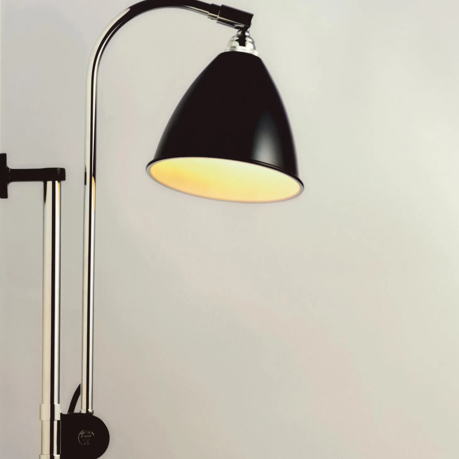 Bestlite BL5 Wall Lamp med skærm og vægbeslag i pulverlakeret aluminium, arm i krom samt ledning i stof fra GUBI. Farve: black semi matt/chrome. Mål: H: 54-87 x Ø 16 cm. Lyskilde: 4-6W LED E14. Design: Robert Dudley Best.