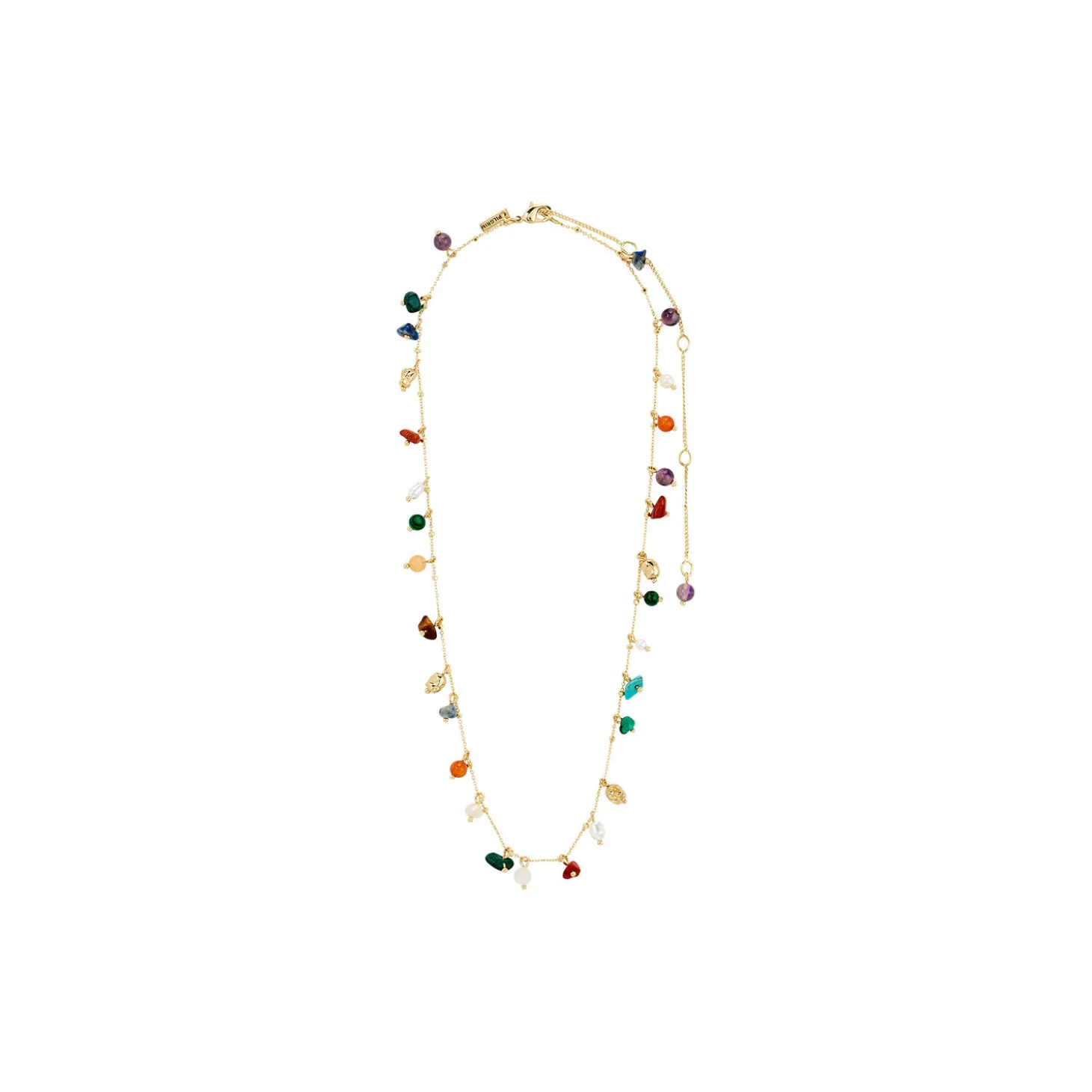 Between the pauses, new paths emerge! Tilføj et dash af luksus-boho til dit look med den guldbelagte BETWEEN-halskæde fra Pilgrim. Farverige halvædelsten som bl.a. Ametyst, Malachite, Aventurine, Turkis, Quartz og Tiger Eye skaber en vibrant, grounded vibe, – et musthave til dig, der elsker personlighed i dit style game. Style den med et flowy dress, en chunky cardigan og slouchy boots for et overbevisende boho-stilet look. Det perfekte accessory for en autentisk og afslappet stil.