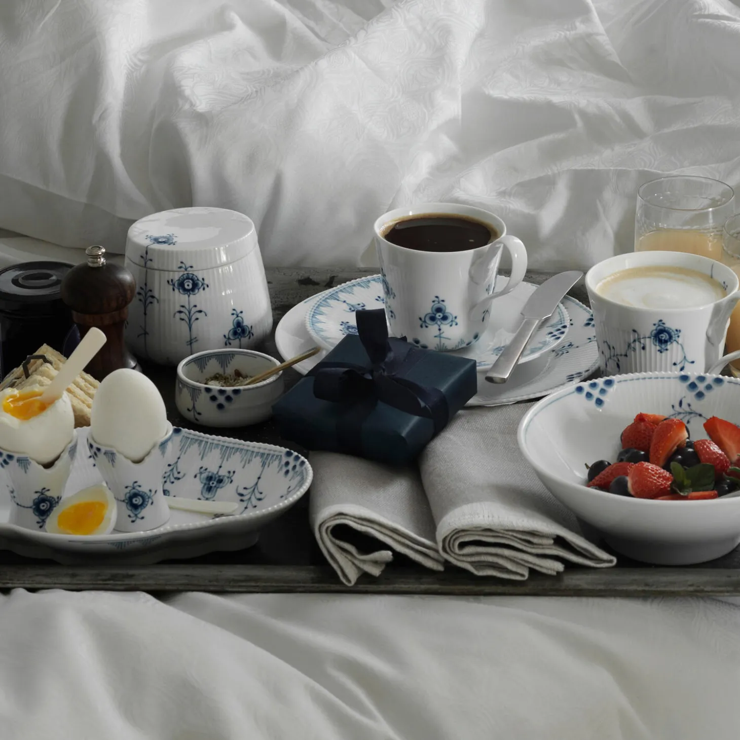 Blå Elements æggebæger i porcelæn fra Royal Copenhagen. Sættet med to Blå Elements Æggebægre på 5,5 cm fremstår i et uhøjtideligt formsprog, der gentænker klassiske elementer fra Royal Copenhagen i en nytænkende sammensætning. En delikat silhuet af en udskåret fiskeskælsdekoration skaber en unik kant på æggebægrene, der er håndmalede i et legende mønster af florale elementer på det riflede porcelæn.