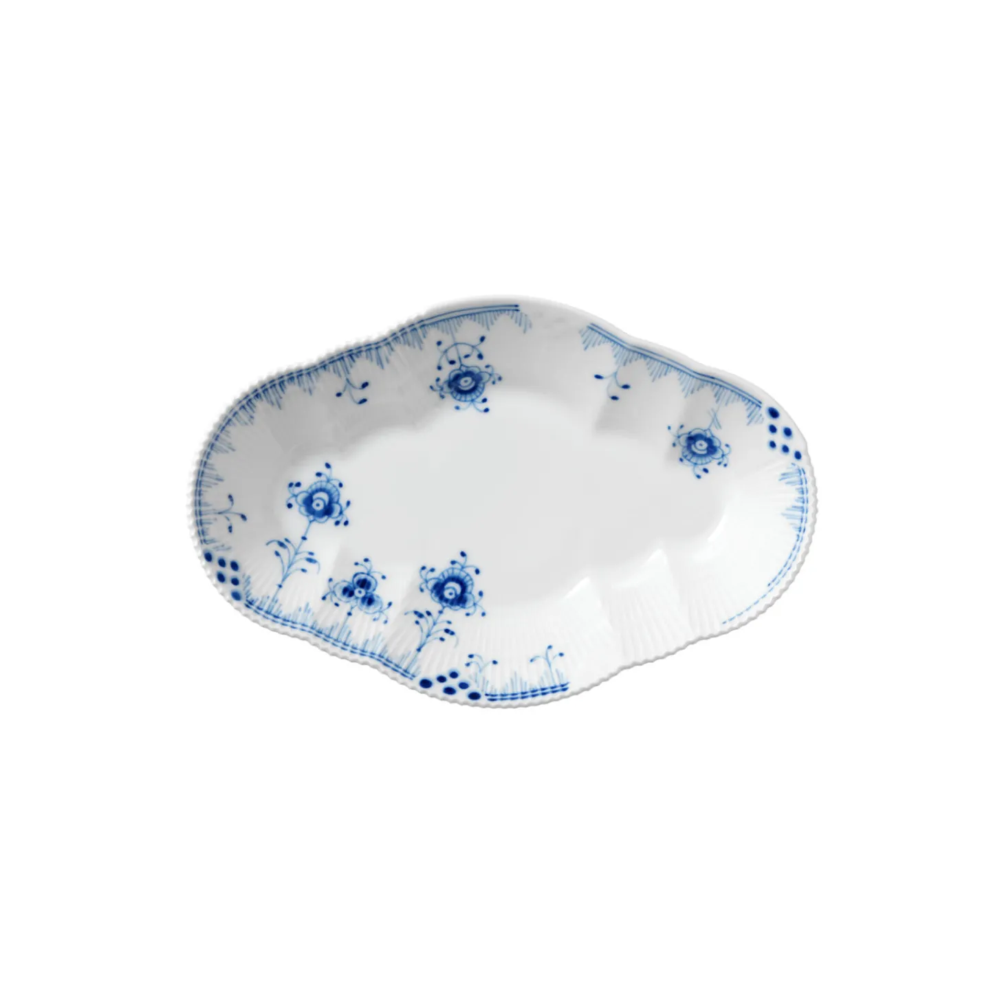 Blå Elements fad i porcelæn fra Royal Copenhagen. Det ovale Blå Elements Fad på 23 cm charmerer med sit særlige formsprog, der er skabt af en legende kombination af ikoniske elementer fra Royal Copenhagens klassiske stel. Det håndmalede mønster komplimenterer den særlige sammensætning af rifler og fiskeskælsdekorationer, mens delikate takker på kanten af fadet udtrykker en smuk elegance i enhver borddækning. Det smukke fad kan, udover at bruges til servering af tilbehør, også fungere som en dyb tallerken til kreative anretninger af forretter og desserter.