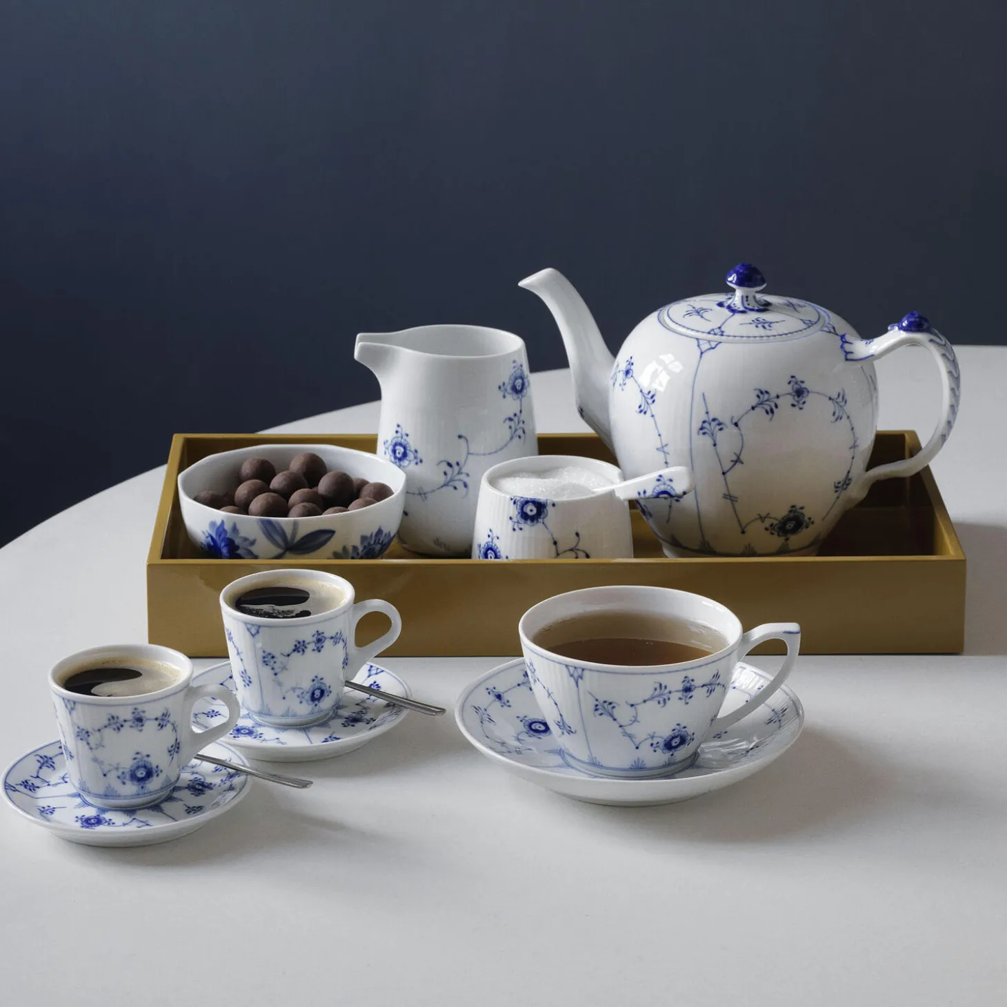Blå Elements kande i porcelæn fra Royal Copenhagen. Farve: hvid/blå. Indeholder: 37 cl. Design: Louise Camphell.