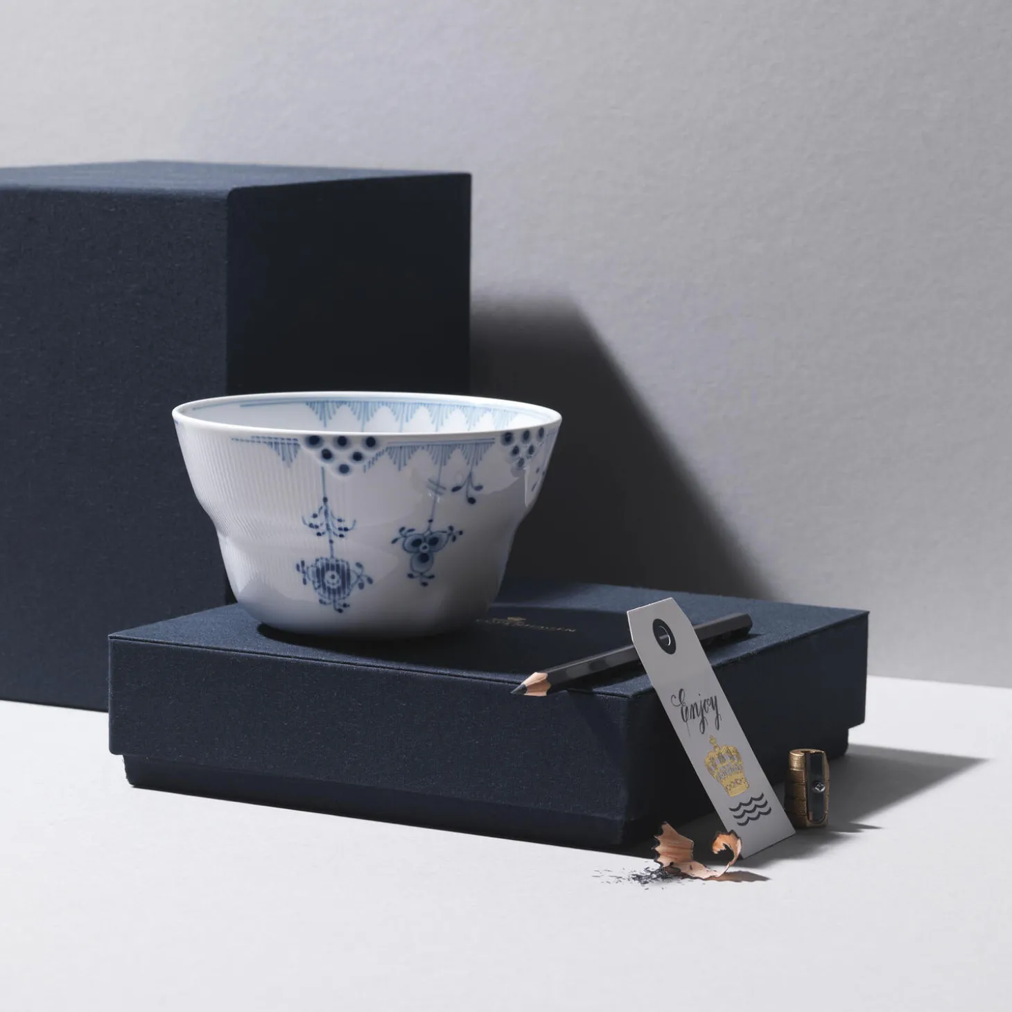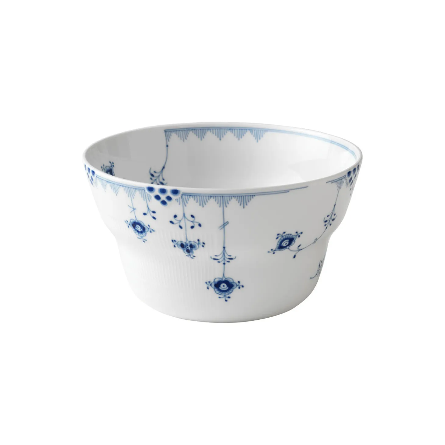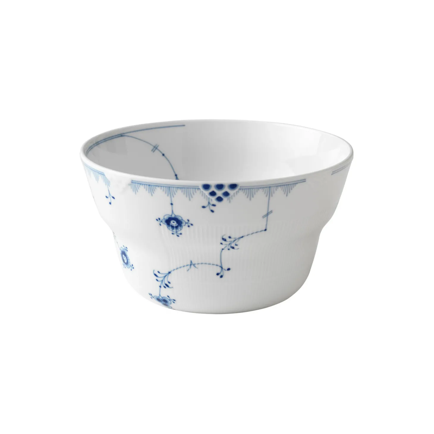 Blå Elements skål i porcelæn fra Royal Copenhagen. Denne udtryksfulde skål på 320 cl er den største af skålene i Blå Elements-stellet. Skålen er håndmalet med et legende mønster af sirlige linjer og florale elementer, som komplimenterer det organiske og lette design, der er skabt med en uhøjtidelig kombination af klassiske rifler og Flora Danicas takkede kant. Skålens størrelse giver plads til store serveringer af tilbehør ved bordet.
