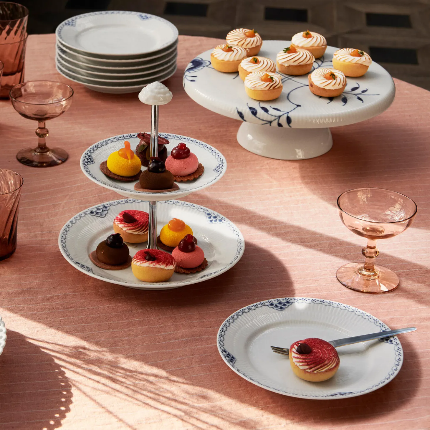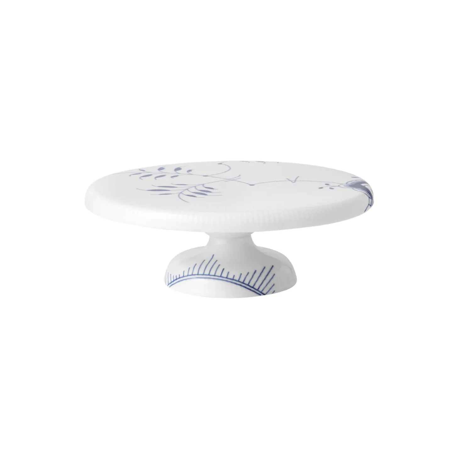 Blå Mega Riflet fad på fod i porcelæn fra Royal Copenhagen. Det større af de to Blå Mega Riflet Fad på fod er en smule lavere end det mindre fad og er med sin store overflade på 29,5 cm oplagt til imponerende serveringer. Fadet er håndmalet med det iøjnefaldende mønster fra Blå Mega Riflet og er et oplagt kagefad.