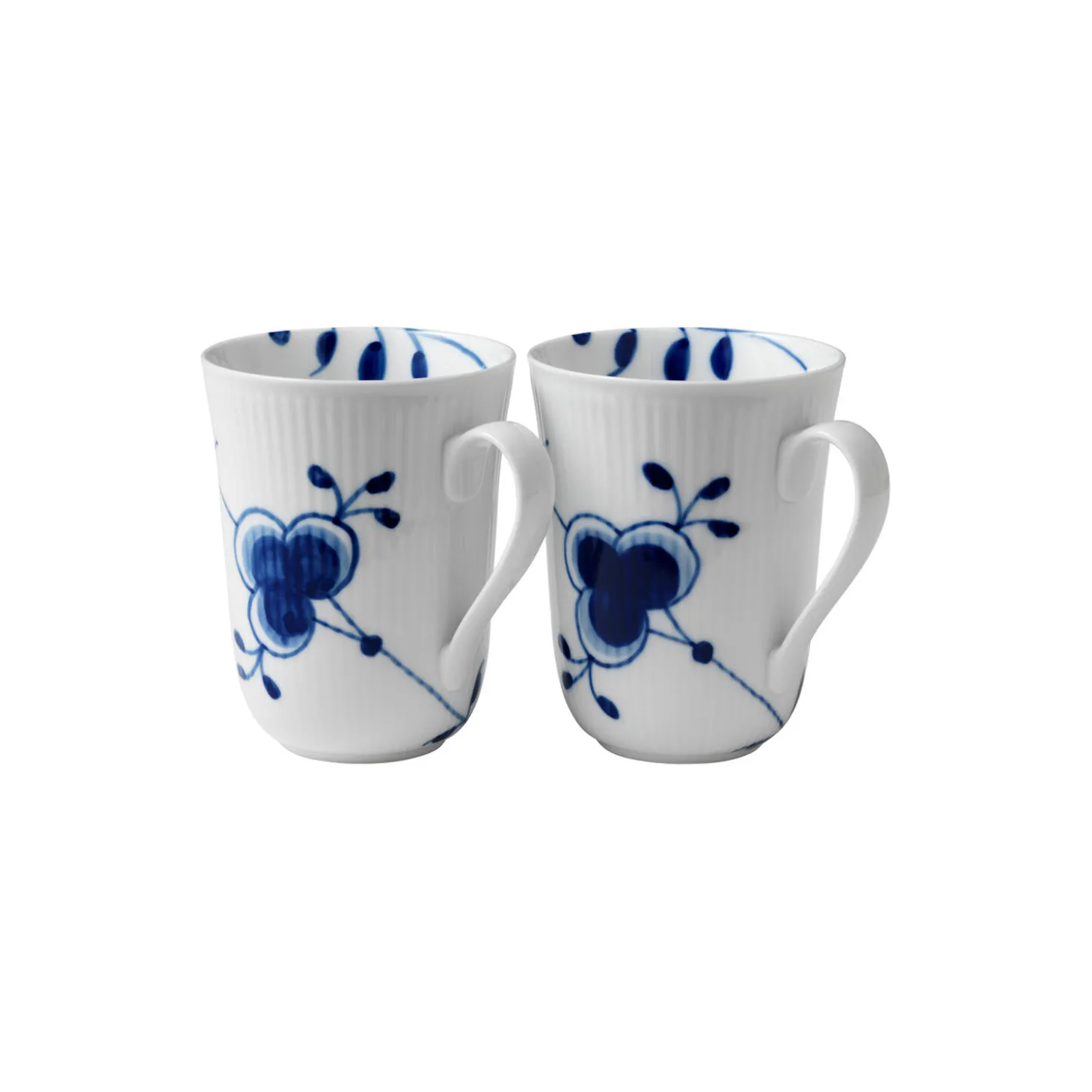 Blå Mega Riflet krus i porcelæn fra Royal Copenhagen. En håndmalet blomst er centralt placeret på midten af disse kopper, mens brudstykker af palmetter draperer top og bund på de to slanke Blå Mega Riflet Krus på 36 cl. Kopperne gør sig godt som tekopper og kaffekopper.
