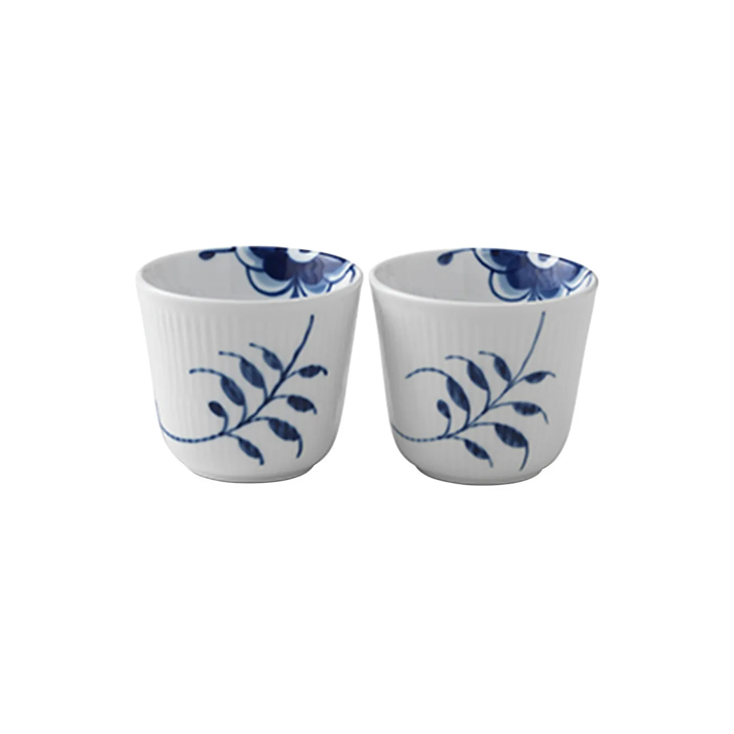 Blå Mega Riflet termokop i porcelæn fra Royal Copenhagen. Dette sæt af to Termokopper på 26 cl i Blå Mega Riflet skaber et iøjefaldende udtryk med deres forstørrede elementer af de håndmalede palmetter og stiliserede blomster fra det musselmalede mønster. Koppernes indre og ydre lag former et hulrum, som hindrer kopperne i at lede varme til ydersiden. Den lille størrelse er perfekt til mindre kopper af din yndlingste eller -kaffe.