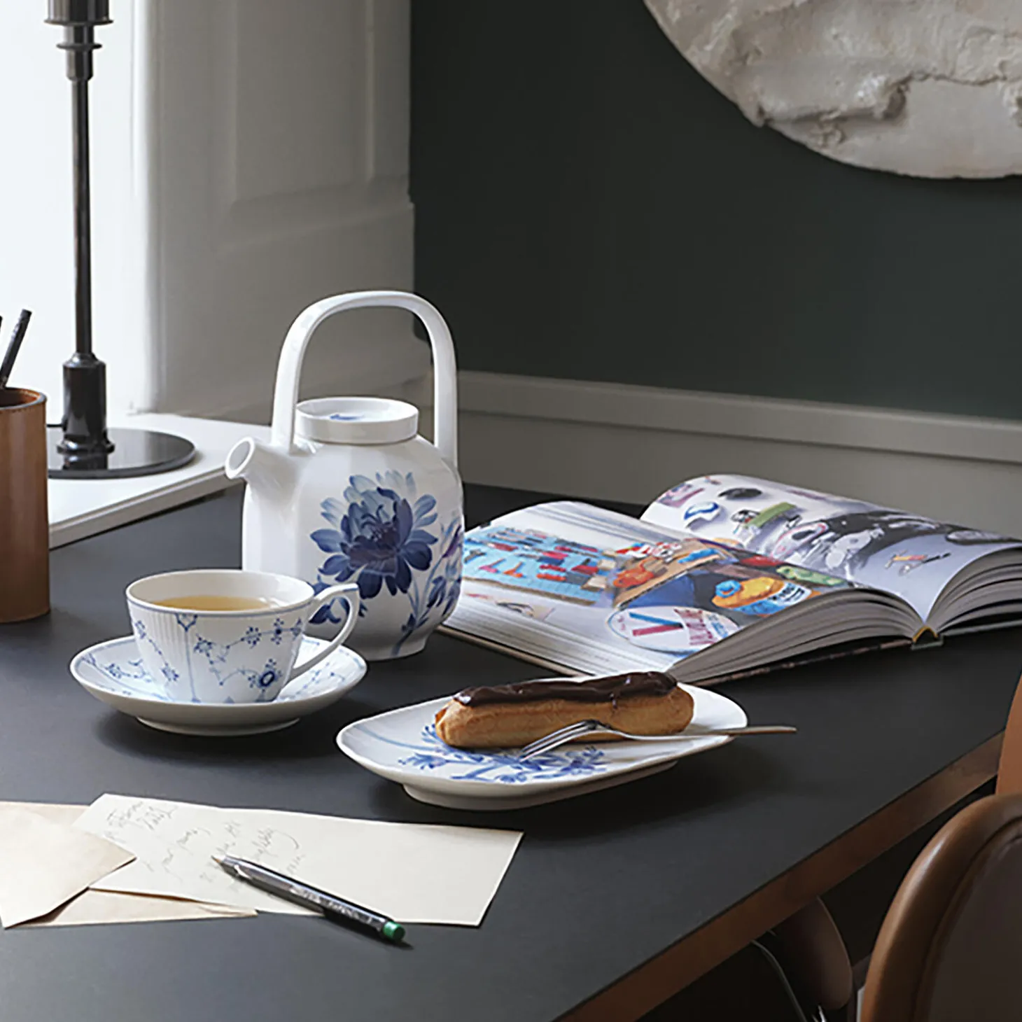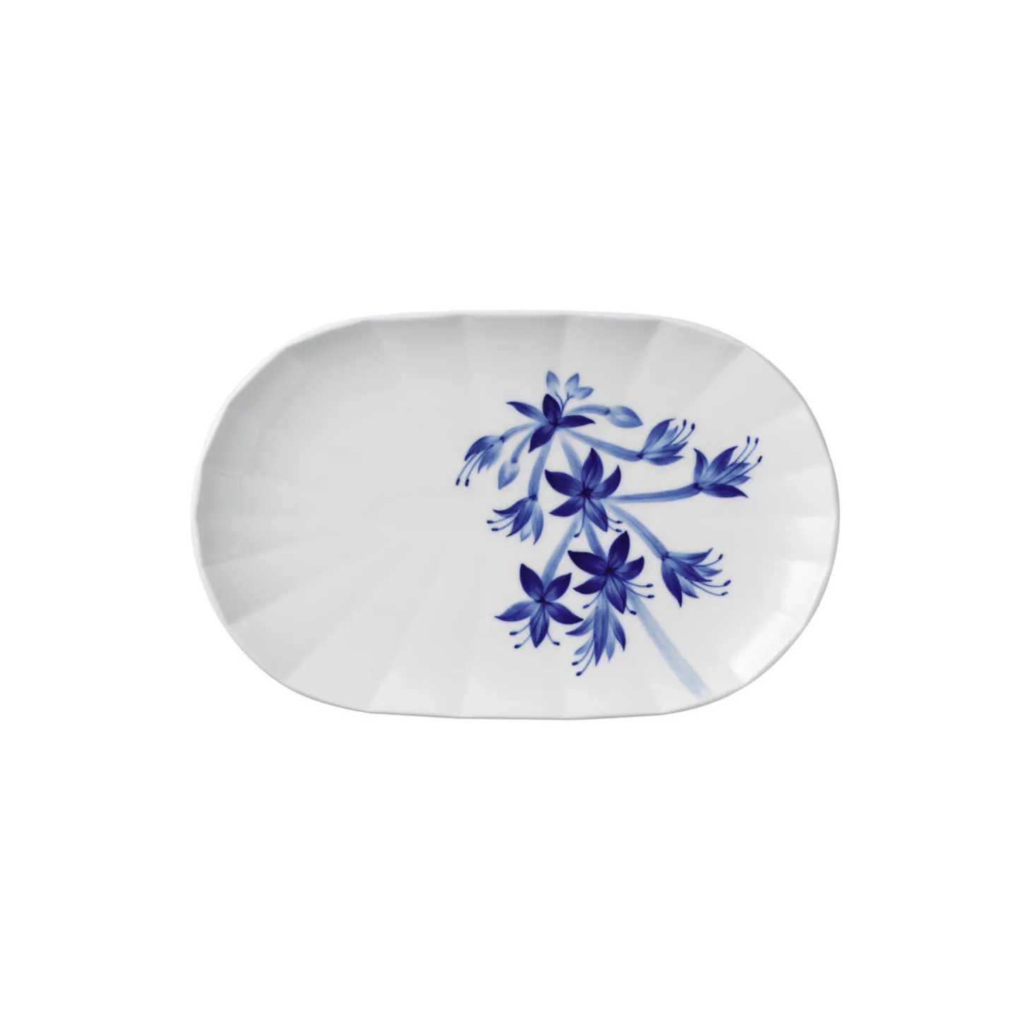 Blomst fad i porcelæn med hosta motiv fra Royal Copenhagen. Med sit karakteristiske, kantede formsprog er det ovale blomst Fad på 24 cm dekoreret med en frodig hosta, der blomstrer i fuldt flor hen over den hvide overflade. De diskrete, geometriske vinkler og en næsten usynlig søjlefod får fadet til at virke som om, det svæver på bordet. Fadets afrundede sider gør det ideelt som et smukt serveringsfad.