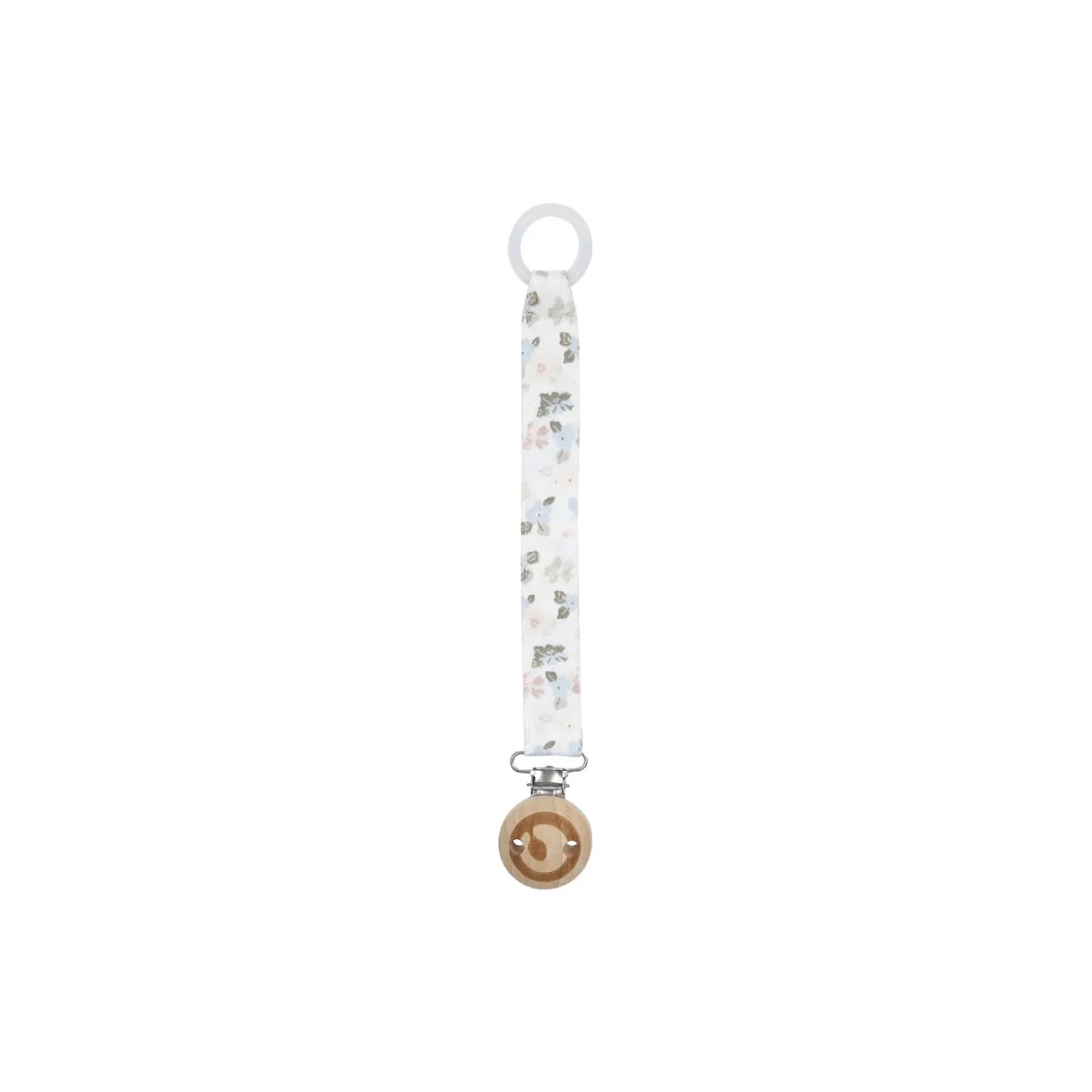 Praktisk suttesnor i smukt printed blomster stof. Sutte-snoren har en metalklips med træ ovenpå så man kan påsætte snoren på trøjen så sutten ikke bliver væk. På enden af sutte-snoren sidder der en gummiring som kan holde på flere forskellige slags sutter. Mål 2×20 cm (GOTS Organic Certified by Ecocert Greenlife Lic. No. 151714). Produktet er GOTS organic- certificeret, hvilket betyder at bomulden er certificeret økologisk, og at der i alle andre processer som farvning, strikning og syning er taget de strengeste hensyn til miljøet. GOTS er internationalt anerkendt som den førende standard for forarbejdning af tekstiler af økologisk bomuld. Derudover tages der også hensyn til arbejdsforholdene, hos dem der producerer tøjet. Økologisk bomuld 100%
