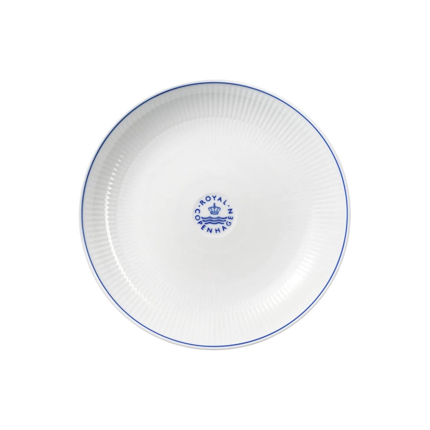 Blueline skål i porcelæn fra Royal Copenhagen. Blueline skålen har en sirligt håndmalet blå linje og Royal Copenhagen stemplet der er kendetegnet for Blueline. En halvdyb skål som er oplagt til servering af små salater eller anden lille servering. Skålen kan også med fordel anvendes som tallerken til portionsserveringer.