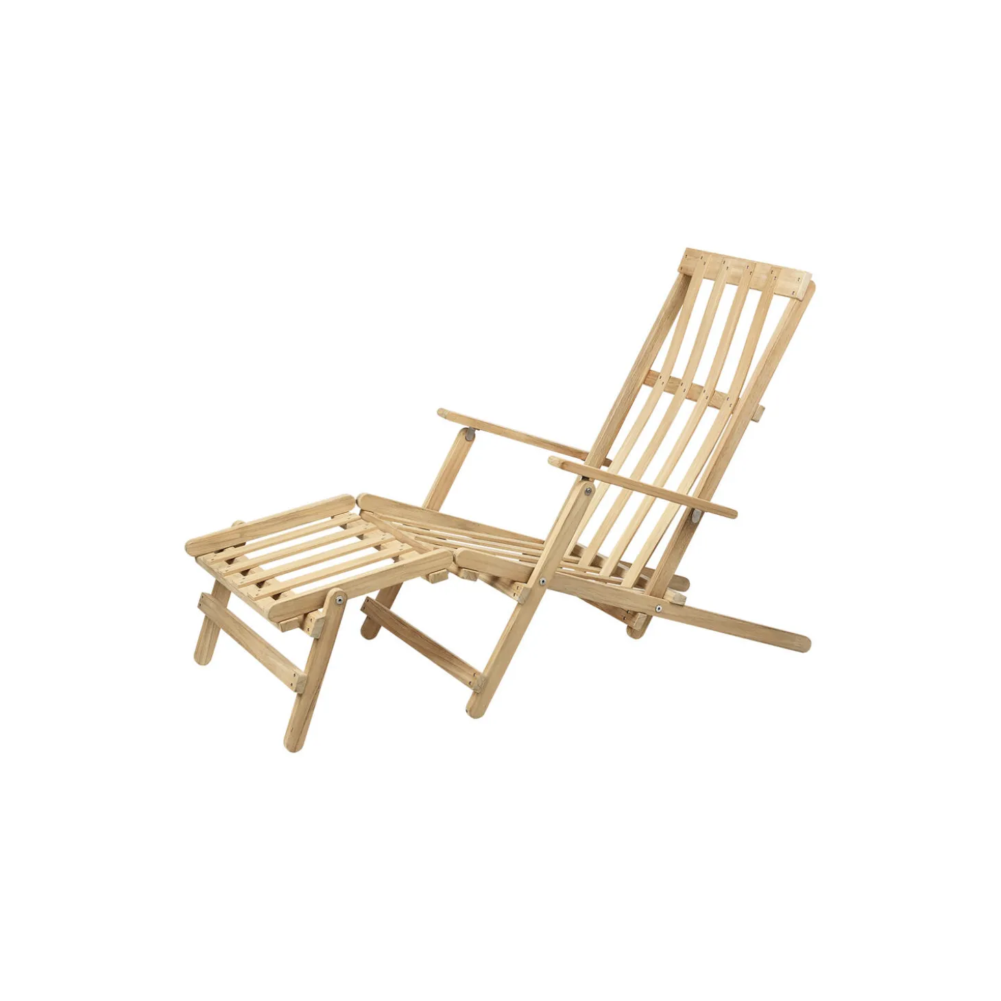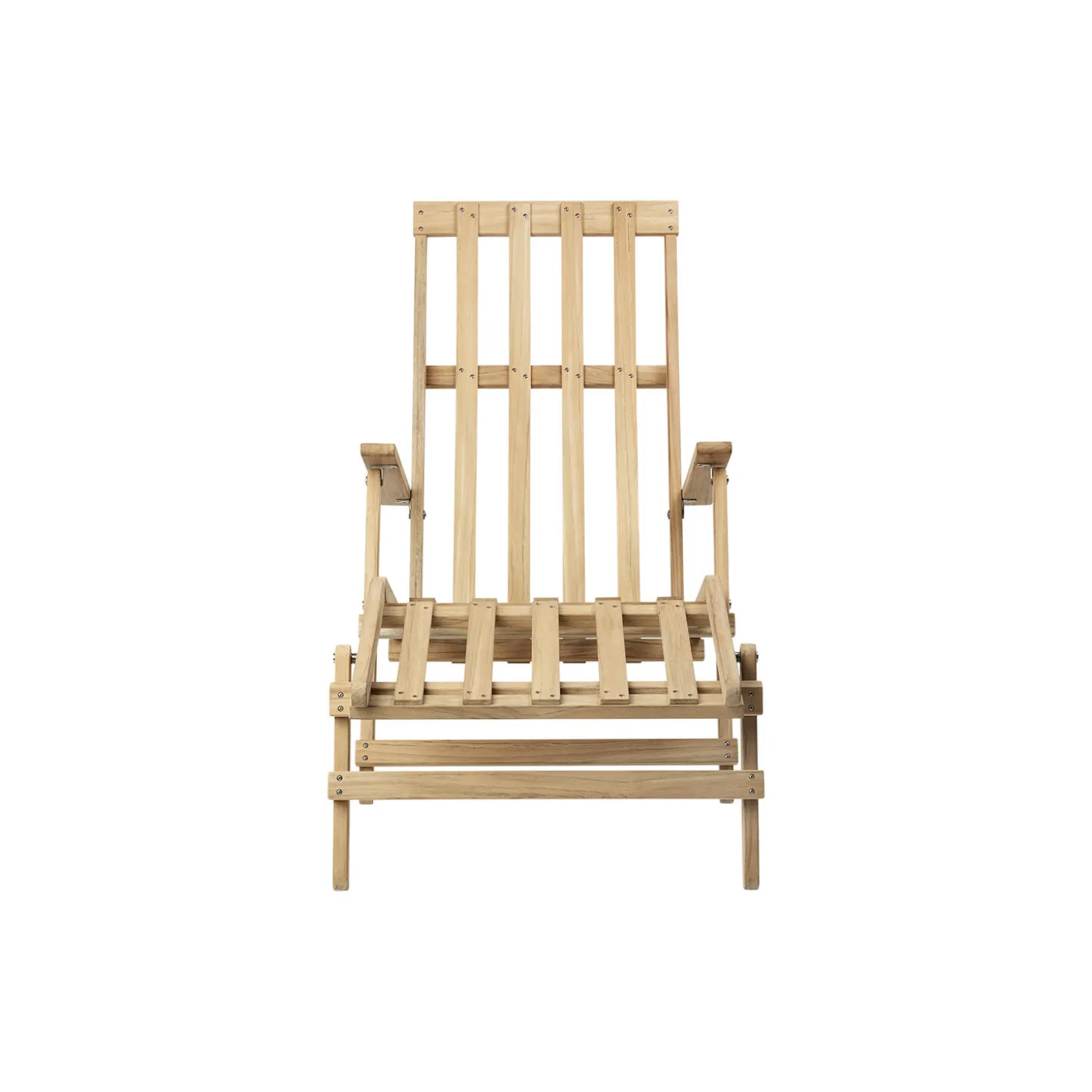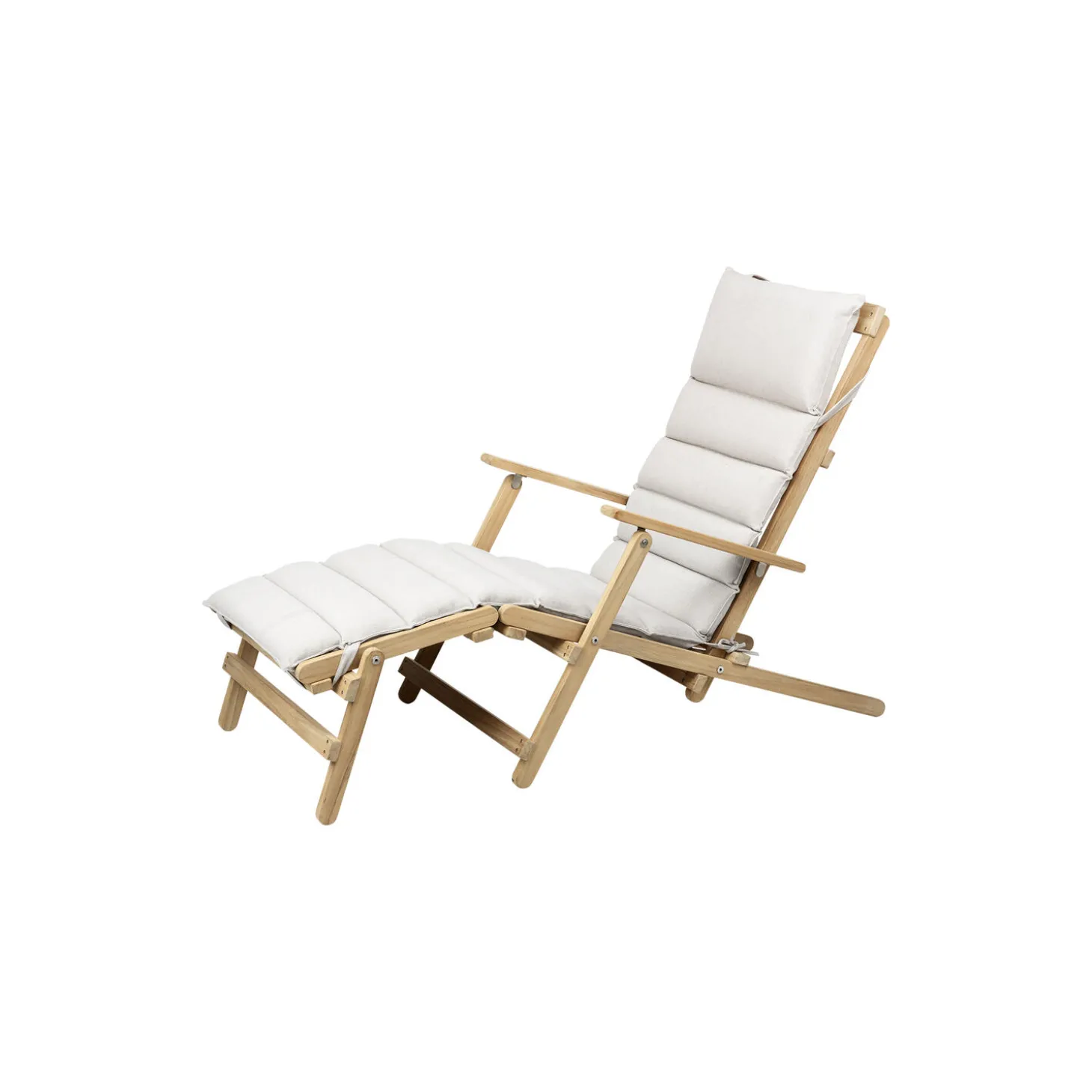 BM5565 dækstol med fodstøtte inkl. hynde i ubehandlet teak med hynde i Heritage Papyrus 18006 Sunbrella® tekstil fra Carl Hansen & Søn. FSC®-certificeret. Farve: ubehandlet teak/beige. Mål: H: 91,5 x B: 60,5 x D: 135 cm. Siddehøjde: 37 cm. Design: Børge Mogensen.