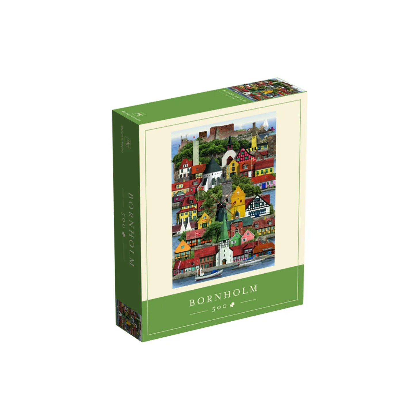 Bornholm puslespil trykt på pap fra Martin Schwartz. Farve: multifarvet. Mål: 33×47 cm. Antal: 500 brikker.